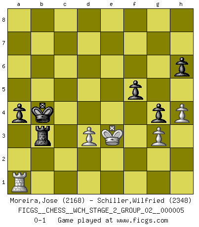 Last move : 0-1 2009 August 20 9:4:28 [Event "FICGS__CHESS__WCH_STAGE_2_GROUP_02__000005"] [Site "FICGS"] [Date "2009.03.15"] [Round "1"] [White "Moreira,Jose"] [Black "Schiller,Wilfried"] [Result "0-1"] [WhiteElo "2168"] [BlackElo "2348"] 1.Nf3 Nf6 2.g3 b6 3.Bg2 Bb7 4.O-O e6 5.d3 Be7 6.Nc3 O-O 7.e4 d6 8.Re1 Nbd7 9.Qe2 a6 10.a4 c5 11.Bf4 h6 12.e5 Nh5 13.Bc1 dxe5 14.Nxe5 Bxg2 15.Nxd7 Qxd7 16.Kxg2 Nf6 17.Qf3 Rac8 18.Bf4 Rfd8 19.h3 Nd5 20.Nxd5 Qxd5 21.Qxd5 Rxd5 22.Re4 Bf6 23.Rae1 Rd7 24.Be3 Bd4 25.Kf3 Rc6 26.Bxd4 cxd4 27.Rc1 g5 28.Ke2 Kg7 29.Kd2 Rd5 30.h4 f5 31.R4e1 g4 32.Ra1 Kf6 33.Ra3 e5 34.Rb3 Rcd6 35.Rb4 Rc5 36.Rb3 Ra5 37.Rb4 Rad5 38.Rd1 a5 39.Rb3 e4 40.Rf1 Kg6 41.Rb1 Re5 42.Ke2 Rde6 43.Rf1 Rf6 44.Rb5 Rxb5 45.axb5 Rf8 46.Rc1 Rc8 47.c4 Kf6 48.Rd1 Ke5 49.Re1 Re8 50.Rf1 Kd6 51.Kd2 Kc5 52.Re1 Kb4 53.Rc1 Kb3 54.c5 Kxb2 55.Rc2+ Kb3 56.Rc1 Kb4 57.cxb6 a4 58.Rb1+ Ka5 59.Ra1 Re5 60.Rb1 Kxb6 61.Rb4 e3+ 62.fxe3 dxe3+ 63.Ke2 Ka5 64.Rb1 Rxb5 65.Ra1 Rb3 66.Kxe3 Kb4 0-1 This chess game has been lost on time (started : 2009.03.15 14:34:40) Reti Opening Kingside Castling by player White (move 4) Kingside Castling by player Black (move 6) Player Black won this chess game. Follow this game move after move (download)Don't even mention losing to me. I can't stand to think of it. (Bobby Fischer) Es ist peinlich, dass ich nie Weltmeister wurde. Es wäre leicht, Leonid Breschnjew als Ursache vorzuschieben, dessen Apparat den Vorzeigekommunisten Anatoli Karpow in allem unterstützte. Aber Garri Kasparow zum Beispiel, der ebenfalls von den Sowjets unerwünscht war, hat trotz der Widerstände den WM-Titel erobert. (Viktor Kortschnoi) No todos los artistas son jugadores de Ajedrez, pero todos los jugadores de Ajedrez son artistas. (Marcel Duchamp) La tactique est l'élément le plus important du milieu de jeu. (Siegbert Tarrasch) All battles are fought by scared men who'd rather be someplace else. (John Wayne in the movie In harm's way)