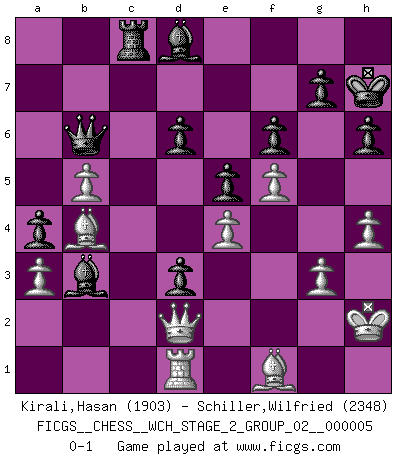Last move : 0-1 2009 July 27 23:45:3 [Event "FICGS__CHESS__WCH_STAGE_2_GROUP_02__000005"] [Site "FICGS"] [Date "2009.03.15"] [Round "1"] [White "Kirali,Hasan"] [Black "Schiller,Wilfried"] [Result "0-1"] [WhiteElo "1903"] [BlackElo "2348"] 1.e4 c5 2.Nf3 Nc6 3.c4 Nf6 4.Nc3 e5 5.g3 d6 6.Bg2 Be7 7.O-O O-O 8.d3 Bg4 9.h3 Be6 10.Bd2 Rb8 11.a3 h6 12.Nd5 b5 13.b3 Qc8 14.Kh2 Qb7 15.Rb1 Rfc8 16.Qc2 Qd7 17.b4 Nd4 18.Nxd4 cxd4 19.Qb3 Bd8 20.f4 bxc4 21.dxc4 Qc6 22.Rbc1 Qb7 23.Qd3 a5 24.Kg1 Ra8 25.b5 Nd7 26.Qf3 Nb6 27.Qb3 Rc5 28.Nxb6 Qxb6 29.f5 Bd7 30.Qf3 Rac8 31.Qd3 a4 32.h4 f6 33.Rfd1 Be8 34.Bf1 Bf7 35.Qb1 R5c7 36.Bb4 Kh7 37.Qa2 d3 38.Kh2 Rxc4 39.Rxc4 Bxc4 40.Qd2 Bb3 0-1 This chess game has been lost on time (started : 2009.03.15 14:34:40) Sicilian defense Kingside Castling by player White (move 7) Kingside Castling by player Black (move 7) Player Black won this chess game. Follow this game move after move (download)When in doubt... play Chess ! (Tevis) Schach ist Kampf, hauptsächlich jedoch gegen die eigenen Fehler. (Savielly Grigorievitsch Tartakower) Todos los jugadores de Ajedrez deberían tener un pasatiempo. (Savielly Tartakower) C'est la seule position que je connaisse où les deux camps sont mals. Propos prêtés à V. Anand. Depression is just anger without enthusiasm. (Unknown)