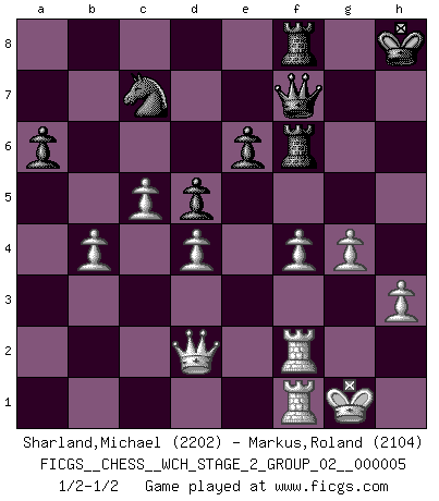 Last move : 1/2-1/2 2009 June 24 10:58:28 [Event "FICGS__CHESS__WCH_STAGE_2_GROUP_02__000005"] [Site "FICGS"] [Date "2009.03.15"] [Round "1"] [White "Sharland,Michael"] [Black "Markus,Roland"] [Result "1/2-1/2"] [WhiteElo "2202"] [BlackElo "2104"] 1.e4 c6 2.d4 d5 3.exd5 cxd5 4.c4 Nf6 5.Nc3 Nc6 6.Bg5 e6 7.Nf3 Be7 8.c5 O-O 9.Bb5 Bd7 10.O-O b6 11.Bxc6 Bxc6 12.Ne5 Rc8 13.Nxc6 Rxc6 14.b4 Rc8 15.Re1 Qd7 16.Qd3 h6 17.Bh4 Rfd8 18.Rac1 Qb7 19.Rb1 a6 20.Na4 b5 21.Nc3 Ra8 22.Ra1 Rdb8 23.a4 bxa4 24.Bg3 Rd8 25.Rxa4 Ne4 26.Be5 Bf6 27.Bxf6 Nxf6 28.Rea1 Ne8 29.Ne2 Nc7 30.Nf4 Nb5 31.h3 Kh8 32.Nh5 Qc6 33.Qe3 Rf8 34.R4a2 Qb7 35.Nf6 Rfb8 36.Ng4 Re8 37.Re2 Rab8 38.Qd2 f6 39.Nxf6 gxf6 40.Qxh6+ Qh7 41.Qxf6+ Qg7 42.Qh4+ Qh7 43.Qf4 Rf8 44.Qd2 Rg8 45.g4 Rg6 46.Re3 Nc7 47.Rf1 Rf8 48.f4 Rgf6 49.Re2 Qf7 50.Ref2 1/2-1/2 Caro-Kann : Panov-Botvinnik, normal variation Kingside Castling by player Black (move 8) Kingside Castling by player White (move 10) This chess game ended in a draw. Follow this game move after move (download)The only thing Chess players have in common is Chess. (Lodewijk Prins) Die FIDE ist dabei in die Hände der russischen Mafia zu fallen. (Larry Evans) No existe un remordimiento como el remordimiento del Ajedrez. (H. G. Wells) Les Echecs, c'est l'art de la guerre sans les charniers, c'est la résurrection des morts tombés au champ d'honneur, l'espoir perpétuel, la suprématie de l'intelligence sur la force, la culture de l'esprit. (F. Szpiner) There's no money in correspondence chess. (John Knudsen)