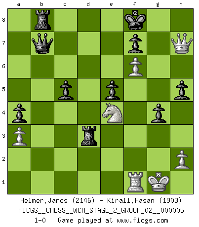 Last move : 1-0 2009 July 29 11:49:37 [Event "FICGS__CHESS__WCH_STAGE_2_GROUP_02__000005"] [Site "FICGS"] [Date "2009.03.15"] [Round "1"] [White "Helmer,Janos"] [Black "Kirali,Hasan"] [Result "1-0"] [WhiteElo "2146"] [BlackElo "1903"] 1.d4 Nf6 2.c4 e6 3.Nf3 b6 4.g3 Bb7 5.Bg2 Be7 6.Nc3 O-O 7.O-O Ne4 8.Qc2 Nxc3 9.Qxc3 Bf6 10.Qc2 Nc6 11.Rd1 d6 12.e4 e5 13.d5 Nb8 14.Bd2 a5 15.b3 Qd7 16.a3 c5 17.Ne1 Qc7 18.Nd3 Nd7 19.Rab1 g6 20.Rf1 Bg7 21.f4 exf4 22.gxf4 Bd4+ 23.Kh1 Rfe8 24.Bc3 a4 25.b4 Bxc3 26.Qxc3 Rac8 27.Nf2 h5 28.Bh3 Rb8 29.Bxd7 Qxd7 30.bxc5 bxc5 31.e5 Bxd5+ 32.cxd5 dxe5 33.Ne4 Qxd5 34.Qf3 Kf8 35.Rbd1 Qb3 36.Rd3 Qb7 37.f5 g5 38.f6 Red8 39.Kg1 g4 40.Qf5 Rxd3 41.Qh7 1-0 This chess game has been lost on time (started : 2009.03.15 14:34:40) Queen's Indian : Anti-Queen's Indian system Kingside Castling by player Black (move 6) Kingside Castling by player White (move 7) Player White won this chess game. Follow this game move after move (download)The stomach is an essential part of the Chess master. (Bent Larsen) Drei Punkte vor allen anderen ist wie einer, der im weißen Anzug posiert, während der Rest in Müllsäcke gekleidet dasteht. (Viktor Kortschnoi) Siempre es mejor sacrificar los hombres de tu oponente. (Savielly Tartakower) Il n'y a pas eu de défaite parce que je ne crois pas que cet ordinateur ait jamais existé. IBM a triché en refusant d'imprimer les modes de recherche de la machine. C'est évident, pendant le match, des coups décisifs ont été joués par des êtres humains. Aujourd'hui, les meilleurs spécialistes en informatique ne peuvent toujours pas expliquer comment Deep-Blue a pu jouer contre la logique des ordinateurs. IBM a gagné une guerre de communication, mais ils sont incapables de prouver que l'ordinateur a gagné tout seul. (Garry Kasparov) Wisdom doesn't necessarily come with age. Sometimes age just shows up all by itself. (Tom Watson)