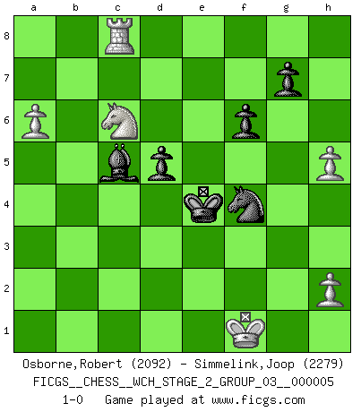 Last move : 1-0 2009 May 29 10:5:38 [Event "FICGS__CHESS__WCH_STAGE_2_GROUP_03__000005"] [Site "FICGS"] [Date "2009.03.15"] [Round "1"] [White "Osborne,Robert"] [Black "Simmelink,Joop"] [Result "1-0"] [WhiteElo "2092"] [BlackElo "2279"] 1.e4 e5 2.Nf3 Nc6 3.Bb5 a6 4.Ba4 Nf6 5.O-O Be7 6.Re1 b5 7.Bb3 O-O 8.c3 d5 9.exd5 Nxd5 10.Nxe5 Nxe5 11.Rxe5 c6 12.d3 Bd6 13.Re1 Bf5 14.Qf3 Re8 15.Rxe8+ Qxe8 16.Nd2 Qe1+ 17.Nf1 Bg6 18.g3 Re8 19.Bd1 Bf5 20.Bd2 Qe6 21.Be2 h5 22.Re1 Bg4 23.Qe4 Qxe4 24.dxe4 Rxe4 25.f3 Rxe2 26.Rxe2 Bxf3 27.Re8+ Kh7 28.Be3 Bg4 29.Ra8 Bh3 30.Bd4 Nc7 31.Rb8 Be6 32.Rb6 Bd5 33.b3 Ne6 34.Rxa6 Bc7 35.Nd2 b4 36.c4 Nxd4 37.cxd5 cxd5 38.Kf2 Ne6 39.Nf3 Kg6 40.Nd4 Kf6 41.Nc2 Kf5 42.Nxb4 Ke4 43.a4 Nd4 44.a5 Nxb3 45.Nc6 Bd6 46.Ra8 Nc5 47.a6 Ne6 48.Rc8 Bc5+ 49.Ke2 h4 50.gxh4 f6 51.h5 Nf4+ 52.Kf1 1-0 Ruy Lopez : Closed, 7...O-O Kingside Castling by player White (move 5) Kingside Castling by player Black (move 7) Player White won this chess game. Follow this game move after move (download)We don't really know how the game was invented, though there are suspicions. As soon as we discover the culprits, we'll let you know. (Bruce Pandolfini) Die jungen Leute sollen verstehen, dass sie noch etwas von mir lernen können und müssen. (Viktor Kortschnoi) Estaba muy claro de que el punto vulnerable del Gran Maestro Americano (Bobby Fischer) radicaba en las posiciones de doble filo, colgantes, irracionales, donde el siempre falló en encontrar un triunfo aún en una posición de clara victoria. (Efim Geller) Ce qui est bien, c'est d'avoir tout un tas de pièces en prise : l'adversaire ne peut en prendre qu'une à la fois. Cité par Thierry Audin. If only faces could talk... (Pat Summerall, Sportscaster during the Super Bowl)