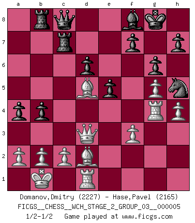 Last move : 1/2-1/2 2009 May 13 17:36:49 [Event "FICGS__CHESS__WCH_STAGE_2_GROUP_03__000005"] [Site "FICGS"] [Date "2009.03.15"] [Round "1"] [White "Domanov,Dmitry"] [Black "Hase,Pavel"] [Result "1/2-1/2"] [WhiteElo "2227"] [BlackElo "2165"] 1.e4 c5 2.Nf3 d6 3.d4 cxd4 4.Nxd4 Nf6 5.Nc3 a6 6.Be3 e5 7.Nb3 Be6 8.f3 Be7 9.Qd2 O-O 10.O-O-O Nbd7 11.g4 b5 12.g5 Nh5 13.Kb1 Nb6 14.Na5 Rc8 15.Rg1 g6 16.Nd5 Nxd5 17.exd5 Bxd5 18.Qxd5 Qxa5 19.Bd3 Qc7 20.Be4 Rfd8 21.h4 Bf8 22.Rd2 Rd7 23.Qb3 Rb8 24.Rgd1 Qc8 25.Bd5 a5 26.Rf2 a4 27.Qd3 Re7 28.Rg2 Rc7 29.Rg4 b4 30.Bd2 Qd7 31.Rc4 Qc8 32.Rg4 Qd7 33.Rc4 Qc8 34.Rg4 1/2-1/2 Sicilian : Najdorf, Byrne (English) attack Kingside Castling by player Black (move 9) Queenside Castling by player White (move 10) This chess game ended in a draw. Follow this game move after move (download)All I want to do, ever, is just play Chess. (Bobby Fischer) Je mehr ich von der FIDE weiss, um so weniger verstehe ich. (Alexander Kalifman) El Ajedrez es un mar en el cual un mosquito puede beber y un elefante puede bañarse. (Refrán Hindú) À la honte des hommes, on sait que les lois du jeu sont les seules qui soient partout justes, claires, inviolables et exécutées. Pourquoi l'Indien qui a donné les règles du jeu d'échecs est-il obéi de bon gré dans toute la terre, et que les décrétales des papes, par exemple, sont aujourd'hui un objet d'horreur et de mépris ? C'est que l'inventeur des échecs combina tout avec justesse pour la satisfaction des joueurs, et que les papes, dans leurs décrétales, n'eurent en vue que leur seul avantage. L'Indien voulut exercer également l'esprit des hommes et leur donner du plaisir; les papes ont voulu abrutir l'esprit des hommes. Voltaire (Dictionnaire philosophique / Garnier 1967) In theory there is no difference between theory and practice. In practice there is. (Yogi Berra)