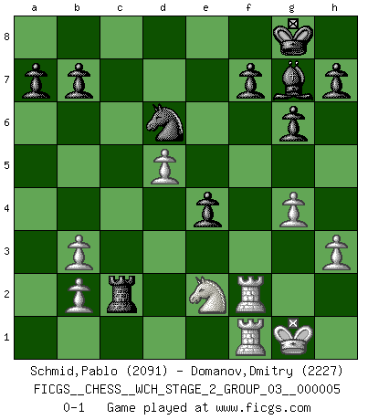 Last move : 0-1 2009 June 16 20:12:27 [Event "FICGS__CHESS__WCH_STAGE_2_GROUP_03__000005"] [Site "FICGS"] [Date "2009.03.15"] [Round "1"] [White "Schmid,Pablo"] [Black "Domanov,Dmitry"] [Result "0-1"] [WhiteElo "2091"] [BlackElo "2227"] 1.d4 Nf6 2.f3 d5 3.e4 dxe4 4.Nc3 exf3 5.Nxf3 g6 6.Bc4 Bg7 7.O-O O-O 8.Qe1 Nc6 9.Qh4 Bg4 10.Be3 Bxf3 11.Rxf3 Qd7 12.Raf1 Rad8 13.Ne2 Qg4 14.Qf2 Ne4 15.Qe1 Nd6 16.h3 Qd7 17.Bb3 e5 18.d5 Ne7 19.c4 Nef5 20.Bg5 e4 21.R3f2 c5 22.dxc6 Qxc6 23.Bxd8 Rxd8 24.g4 Nd4 25.Qa5 Rc8 26.Qd5 Qxd5 27.cxd5 Nxb3 28.axb3 Rc2 0-1 This chess game has been lost on time (started : 2009.03.15 14:34:35) Blackmar-Diemer gambit Kingside Castling by player White (move 7) Kingside Castling by player Black (move 7) Player Black won this chess game. Follow this game move after move (download)Without error there can be no brilliancy. (Emanuel Lasker) Ich weiss nicht was Gott gegen mich auf 1.e4 antworten würde. (Robert James Fischer) Uno por uno, yo los acribillé, mi superioridad muy pronto se volvio aparente. (Jose Capablanca) Il n'y a plus de joueurs du niveau de Jacob Murray dont la seule quête est le beau jeu, le plaisir de voir les pièces construire quelque chose. Sur 10 idées à la minute, 9 seront sans intérêt, la dernière s'avèrera géniale. (Christian Bauer) Luck is the residue of design. (John Milton)