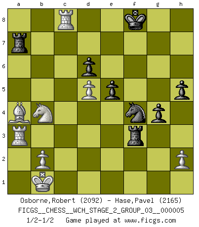 Last move : 1/2-1/2 2009 July 23 7:19:31 [Event "FICGS__CHESS__WCH_STAGE_2_GROUP_03__000005"] [Site "FICGS"] [Date "2009.03.15"] [Round "1"] [White "Osborne,Robert"] [Black "Hase,Pavel"] [Result "1/2-1/2"] [WhiteElo "2092"] [BlackElo "2165"] 1.e4 c5 2.Nf3 d6 3.d4 cxd4 4.Nxd4 Nf6 5.Nc3 a6 6.Be3 e5 7.Nb3 Be6 8.f3 Be7 9.Qd2 O-O 10.O-O-O Nbd7 11.g4 b5 12.g5 Nh5 13.Nd5 Bxd5 14.exd5 f6 15.gxf6 Bxf6 16.Na5 Qe8 17.Kb1 Bd8 18.Rg1 Nf4 19.Nb7 Be7 20.Qc3 Rc8 21.Qa5 Rb8 22.Qc7 Qc8 23.Qxc8 Rbxc8 24.Na5 Bd8 25.Nc6 Ra8 26.c4 Bb6 27.Bxb6 Nxb6 28.cxb5 axb5 29.Bxb5 Rf6 30.Rd2 Kf8 31.Rc1 Rh6 32.Nb4 Ra5 33.Bc6 Rh3 34.Rc3 g5 35.Rdc2 h5 36.a3 Ra7 37.a4 Nxa4 38.Ra3 g4 39.Bxa4 Rxf3 40.Rc8+ 1/2-1/2 Sicilian : Najdorf, Byrne (English) attack Kingside Castling by player Black (move 9) Queenside Castling by player White (move 10) This chess game ended in a draw. Follow this game move after move (download)Those who say they understand Chess, understand nothing. (Robert Hubner) Im Schach gibt es keinen Platz für Galanterie. (Irving Chernev) Cuando la partida de Ajedrez termina, el Peón y el Rey regresan a la misma caja. (Irish saying) La menace est plus forte que l'exécution. (Aaron Nimzovitch) When it is a question of money, everybody is of the same religion. (Voltaire)