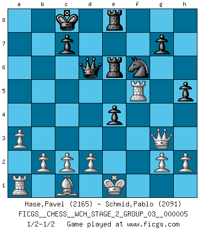 Last move : 1/2-1/2 2009 April 30 8:54:54 [Event "FICGS__CHESS__WCH_STAGE_2_GROUP_03__000005"] [Site "FICGS"] [Date "2009.03.15"] [Round "1"] [White "Hase,Pavel"] [Black "Schmid,Pablo"] [Result "1/2-1/2"] [WhiteElo "2165"] [BlackElo "2091"] 1.e4 e5 2.Nf3 Nc6 3.Bb5 f5 4.Nc3 fxe4 5.Nxe4 d5 6.Nxe5 dxe4 7.Nxc6 Qg5 8.Qe2 Nf6 9.f4 Qxf4 10.Nxa7 Bd7 11.Bxd7+ Kxd7 12.Qb5+ Ke6 13.Qb3+ Kd7 14.Qxb7 Bd6 15.Qb5+ Ke6 16.Qb3+ Kd7 17.Qf7+ Kd8 18.Nc6+ Kc8 19.Ne7+ Bxe7 20.Qxe7 Re8 21.Qc5 Ra6 22.Qe3 Qf5 23.Rf1 Qd7 24.Qh3 Rae6 25.Rf5 Qd6 26.a3 h5 27.Qg3 Qc6 28.Qc3 Qd6 29.Qg3 Qc6 30.Qc3 Qd6 31.Qg3 1/2-1/2 Ruy Lopez : Schliemann defense, Berger variation This chess game ended in a draw. Follow this game move after move (download)Strategy requires thought, tactics require observation. (Max Euwe) Modernes Schach sorgt sich zuviel um Dinge wie Bauernstruktur usw. Vergessen Sie das, Schachmatt beendet das Spiel! (Nigel Short) Al jugar al Ajedrez entonces, podemos aprender: Primero: Previsión... Segundo: Prudencia... Tercero: Cautela... Y al final, aprendemos del Ajedrez el hábito de no ser desanimados por apariencias malas presentes en el estado de nuestros asuntos, el hábito de la esperanza por una oportunidad favorable y la perseveración de los secretos de los recursos. (Benjamin Franklin) Le joueur d'Echecs qui veut atteindre le top est obligé de développer son propre credo créatif. Alexeï Stepanovicth Souétine. Il est facile d'écrire des livres ! Ce qui est difficile, c'est de jouer ! (Alexeï Stepanovicth Souétine) Dave, my mind is going. I can feel it. (HAL 9000 in 2001, a space odyssey)