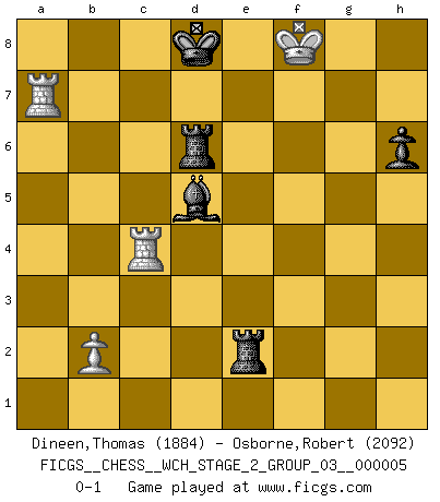 Last move : 0-1 2009 August 8 5:26:55 [Event "FICGS__CHESS__WCH_STAGE_2_GROUP_03__000005"] [Site "FICGS"] [Date "2009.03.15"] [Round "1"] [White "Dineen,Thomas"] [Black "Osborne,Robert"] [Result "0-1"] [WhiteElo "1884"] [BlackElo "2092"] 1.d4 d5 2.c4 c6 3.Nf3 Nf6 4.Nc3 e6 5.e3 Nbd7 6.Bd3 dxc4 7.Bxc4 b5 8.Bd3 Bb7 9.O-O a6 10.e4 c5 11.d5 Qc7 12.dxe6 fxe6 13.Bc2 Bd6 14.Ng5 Nf8 15.f4 O-O-O 16.Qe2 h6 17.Nh3 e5 18.f5 c4 19.Nf2 Bc5 20.Be3 Kb8 21.Rac1 Bd4 22.a4 Qb6 23.Rfe1 N8d7 24.axb5 axb5 25.Qf3 Bxe3 26.Qxe3 Qxe3 27.Rxe3 b4 28.Na4 Bc6 29.Rg3 Nh5 30.Re3 Bb5 31.Bd1 Nhf6 32.Be2 Bxa4 33.Rxc4 Nb6 34.Rxb4 Kc7 35.Rg3 Rhg8 36.Nd3 Nfd7 37.Bh5 Rdf8 38.Bg6 Rf6 39.Bh7 Ra8 40.Rxg7 Kc6 41.h4 Rd6 42.Rg6 Kc7 43.Nxe5 Rd1+ 44.Kf2 Nxe5 45.Rgxb6 Bc6 46.Bg6 Rad8 47.Kg3 Rh1 48.Kf4 Nxg6+ 49.fxg6 Rxh4+ 50.Kf5 Rf8+ 51.Ke5 Rh5+ 52.Ke6 Rf2 53.e5 Rxg2 54.Kf6 Rhg5 55.Ra6 Rxg6+ 56.Ke7 Rg7+ 57.Kf8 Rg8+ 58.Ke7 Re8+ 59.Kf6 Rf2+ 60.Kg7 Rxe5 61.Rc4 Re6 62.Ra5 Rg2+ 63.Kf7 Rd6 64.Ke7 Re2+ 65.Kf8 Kd8 66.Ra7 Bd5 0-1 QGD Slav : 4.Nc3 Kingside Castling by player White (move 9) Queenside Castling by player Black (move 15) 10 pieces endgame at move 55 : White KRRPP , Black KRRBP WHITE : King + 2 Rooks 2 Pawns BLACK : King + 2 Rooks 1 Bishop 1 Pawn 9 pieces endgame at move 60 : White KRRP , Black KRRBP WHITE : King + 2 Rooks 1 Pawn BLACK : King + 2 Rooks 1 Bishop 1 Pawn Player Black won this chess game. Follow this game move after move (download)I am the best player in the world and I am here to prove it. (Bobby Fischer) Du weisst es gibt ein Problem mit Computern und Fernschach, wenn jeder eine Rating von 2450 hat. (John Christen Knudsen) Bobby solo arroja las piezas y solas caen en las casillas correctas. (Miguel Najdorf ) Avant la finale, les dieux ont créé le milieu de partie. (Tarrasch) The Internet is the world's largest library. It's just that all the books are on the floor. (John Allen Paulos)