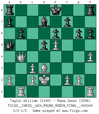 Last move : 1/2-1/2 2009 July 18 10:44:13 [Event "FICGS__CHESS__WCH_ROUND_ROBIN_FINAL__000004"] [Site "FICGS"] [Date "2009.03.15"] [Round "1"] [White "Taylor,William"] [Black "Repa,Jason"] [Result "1/2-1/2"] [WhiteElo "2140"] [BlackElo "2336"] 1.e4 e6 2.d4 d5 3.Nc3 Nf6 4.Bg5 Bb4 5.e5 h6 6.Bd2 Bxc3 7.bxc3 Ne4 8.Qg4 g6 9.Bd3 Nxd2 10.Kxd2 c5 11.h4 Qa5 12.Nf3 Nc6 13.Qf4 cxd4 14.Nxd4 Nxd4 15.Qxd4 Bd7 16.Rab1 b6 17.Qb4 1/2-1/2 French : MacCutcheon, Lasker variation This chess game ended in a draw. Follow this game move after move (download)If a ruler does not understand Chess, how can he rule over a kingdom ? (King Khusros II) Rubinstein ist ein Turmendspiel, welches die Götter vor tausenden von Jahren begannen. (Savielly Grigorievitsch Tartakower) No soy una persona materialista y por eso, no resiento la falta o pérdida del dinero. La ausencia de cosas mundanas carece de importancia. Ya que el Ajedrez es una forma en la que puedo ser tan materialista como yo desee sin tener la necesidad de vender mi alma. (Jamie Walter Adams) Le temps de noter son nom sur la feuille de partie, j'étais déjà en zeitnot ! D'un modeste amateur apparié lors de la première ronde d'un open contre le grand-maître Azmaïparashvili. The real danger is not that computers will begin to think like men, but that men will begin to think like computers. (Sydney J. Harris)