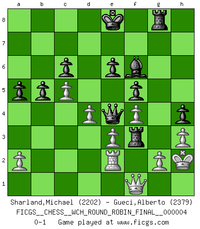 Last move : 0-1 2009 June 14 18:34:59 [Event "FICGS__CHESS__WCH_ROUND_ROBIN_FINAL__000004"] [Site "FICGS"] [Date "2009.03.15"] [Round "1"] [White "Sharland,Michael"] [Black "Gueci,Alberto"] [Result "0-1"] [WhiteElo "2202"] [BlackElo "2379"] 1.d4 d5 2.c4 c6 3.Nc3 Nf6 4.e3 a6 5.Nf3 b5 6.b3 Bg4 7.Be2 e6 8.O-O Nbd7 9.h3 Bf5 10.Nh4 Ne4 11.Nxf5 Nxc3 12.Nxg7+ Bxg7 13.Qc2 Nxe2+ 14.Qxe2 dxc4 15.bxc4 Nb6 16.c5 Nc4 17.Bb2 Nxb2 18.Qxb2 Qd5 19.Qc2 Rg8 20.f4 h5 21.Kh2 h4 22.Rf3 f5 23.Qd2 a5 24.Rb1 Bf6 25.Rb2 Ra7 26.Qe1 Qe4 27.Qe2 Rag7 28.Qf1 Rg3 29.Re2 Rxf3 0-1 QGD Slav defense Kingside Castling by player White (move 8) Player Black won this chess game. Follow this game move after move (download)What would Chess be without silly mistakes ? (Kurt Richter) Die Jungen erwarten, dass Opa einfach umfällt. Dann aber kann Opa fünf Stunden lang Schach spielen und die jungen Gegner an die Wand drücken. (Viktor Kortschnoi) Yo adoro todas la posiciones. Denme una partida posicional difícil, y la jugaré. Pero posiciones totalmente ganadas, no las tolero. (Hein Donner) A ce moment-là, je menaçais de comprendre la position ! (Clément L'Heureux) Life is pain my dear and anyone who says otherwise is selling something. (Princess Bride)