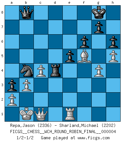 Last move : 1/2-1/2 2009 August 11 16:43:30 [Event "FICGS__CHESS__WCH_ROUND_ROBIN_FINAL__000004"] [Site "FICGS"] [Date "2009.03.15"] [Round "1"] [White "Repa,Jason"] [Black "Sharland,Michael"] [Result "1/2-1/2"] [WhiteElo "2336"] [BlackElo "2202"] 1.e4 c5 2.Nf3 d6 3.d4 cxd4 4.Nxd4 Nf6 5.Nc3 a6 6.Be3 e6 7.f3 b5 8.g4 h6 9.Qd2 b4 10.Na4 Nbd7 11.O-O-O Ne5 12.b3 Bd7 13.Nb2 d5 14.Bf4 Ng6 15.Bg3 dxe4 16.Nc4 Nd5 17.h4 Bc5 18.h5 Nge7 19.fxe4 Nc3 20.Bd6 Nxe4 21.Qh2 Nxd6 22.Nxd6+ Bxd6 23.Qxd6 O-O 24.Qxb4 Rb8 25.Qd6 Nd5 26.Kb2 a5 27.Qe5 a4 28.c4 a3+ 29.Ka1 f6 30.Qe1 Nb4 31.Bd3 e5 32.Nf5 Qa5 33.Be4 Bxf5 34.Bxf5 Rfd8 35.Kb1 Rxd1+ 36.Qxd1 Qa8 37.Re1 Rd8 38.Qc1 Rd4 39.Qc3 Qb8 40.Qc1 1/2-1/2 Sicilian : Najdorf, Byrne (English) attack Queenside Castling by player White (move 11) Kingside Castling by player Black (move 23) This chess game ended in a draw. Follow this game move after move (download)It was clear to me that the vulnerable point of the American Grandmaster (Bobby Fischer) was in double-edged, hanging, irrational positions, where he often failed to find a win even in a won position. (Efim Geller) Wenn du auf das Glück wartest, wird das Leben ziemlich langweilig. (Mikhail Nekhemyevich Tal) De eso se trata el Ajedrez. Un día le das una lección a tu oponente y al día siguiente el te da una a tí. (Bobby Fischer) Les écrivains ont utilisé les échecs pour analyser les côtés extrêmes de la nature humaine. Dans ce cadre, les échecs offrent un champ d'expérimentation idéal. Mais on pourrait faire la même chose avec la peinture. Et là, en vous référant à Van Gogh, vous ne tirerez pas de conclusion définitive sur les peintres. (Gary Kasparov) Life is like a ten-speed bicycle: most of us have gears we never use. (Charles M. Schulz)