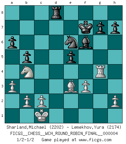 Last move : 1/2-1/2 2009 July 1 7:57:11 [Event "FICGS__CHESS__WCH_ROUND_ROBIN_FINAL__000004"] [Site "FICGS"] [Date "2009.03.15"] [Round "1"] [White "Sharland,Michael"] [Black "Lemekhov,Yura"] [Result "1/2-1/2"] [WhiteElo "2202"] [BlackElo "2174"] 1.e4 c5 2.Nf3 d6 3.d4 cxd4 4.Nxd4 Nf6 5.Nc3 a6 6.Be3 e5 7.Nb3 Be6 8.f3 Be7 9.Qd2 O-O 10.O-O-O Nbd7 11.g4 b5 12.g5 Nh5 13.Kb1 Nb6 14.Nd5 Nxd5 15.exd5 Bf5 16.Na5 f6 17.Nc6 Qd7 18.gxf6 Bxf6 19.Rg1 Bg6 20.Bd3 Bxd3 21.Qxd3 Bd8 22.Rdf1 Nf4 23.Qd2 Qf7 24.Rd1 Rc8 25.a3 Qxd5 26.Na7 Qxd2 27.Rxd2 Ra8 28.Rxd6 Rf6 29.Rd7 Ne6 30.Rg3 Rf7 31.Rxf7 Kxf7 32.Nc6 Bf6 33.Rg4 Rc8 34.Nb4 Rd8 35.Kc1 1/2-1/2 Sicilian : Najdorf, Byrne (English) attack Kingside Castling by player Black (move 9) Queenside Castling by player White (move 10) This chess game ended in a draw. Follow this game move after move (download)When you don't know what to play, wait for an idea to come into your opponent's mind. You may be sure that idea will be wrong. (Siegbert Tarrasch) Ich hatte Angst gegen einen russischen Großmeister zu verlieren, und er befürchtete gegen einen kleinen Jungen zu verlieren. (über ein Remis gegen Juri Awerbach). (Robert James Fischer) El Ajedrez es despiadado: debes de estar preparado para matar gente. (Nigel Short) Avant la finale, les dieux ont créé le milieu de partie. (Tarrasch) Men should grow up. - Yeah. And dogs should stop licking themselves. It's not gonna happen. (Gregory House to Dr. Cameron, House M.D.)