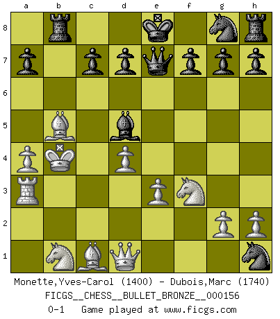 Last move : 0-1 2009 December 15 2:26:53 [Event "FICGS__CHESS__BULLET_BRONZE__000156"] [Site "FICGS"] [Date "2009.12.15"] [Round "1"] [White "Monette,Yves-Carol"] [Black "Dubois,Marc"] [Result "0-1"] [WhiteElo "1400"] [BlackElo "1740"] 1.a4 e5 2.d4 exd4 3.Ra3 Nc6 4.e3 Nb4 5.c3 Nd3+ 6.Kd2 Nxf2 7.cxd4 Nxh1 8.Bc4 b5 9.Bxb5 Bb7 10.b4 Bxb4+ 11.Kc2 Rc8 12.Kb3 Bd5+ 13.Kxb4 Rb8 14.Nf3 Qe7+ 0-1 Ware (Meadow Hay) Opening Player Black won this chess game. Follow this game move after move (download)I like to say that Bobby Fischer was the greatest player ever. But what made Fischer a genius was his ability to blend an American freshness and pragmatism with Russian ideas about strategy. (Bruce Pandolfini) Jeder Schachmeister war einmal ein Anfänger. (Irving Chernev) Una buena memoria, concentración, imaginación y una fuerte voluntad, se requiere para llegar a ser un buen jugador. (Bobby Fischer) Le système Elo représente seulement une moyenne. Il est simplement un indicateur de votre stabilité. (Anatoli Karpov) The quality of decision is like the well-timed swoop of a falcon which enables it to strike and destroy its victim. (Sun Tzu)
