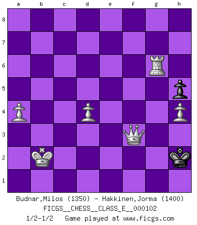 Last move : 1/2-1/2 2009 May 20 9:37:39 [Event "FICGS__CHESS__CLASS_E__000102"] [Site "FICGS"] [Date "2009.03.18"] [Round "1"] [White "Budnar,Milos"] [Black "Hakkinen,Jorma"] [Result "1/2-1/2"] [WhiteElo "1350"] [BlackElo "1400"] 1.e4 e5 2.Nf3 Nc6 3.Bc4 Bc5 4.Nc3 Nf6 5.Ng5 O-O 6.Bxf7 Rxf7 7.Nxf7 Kxf7 8.Nd5 Kg8 9.d3 Nxd5 10.exd5 Nd4 11.c3 Nf5 12.Qf3 d6 13.Bd2 Qf6 14.O-O-O Nh4 15.Qxf6 gxf6 16.g3 Ng6 17.f4 exf4 18.gxf4 Bf5 19.d4 Bb6 20.h4 Kf7 21.Be3 h5 22.b4 a5 23.b5 Be4 24.Rh2 Bxd5 25.f5 Ne7 26.Rf2 Rg8 27.Kb2 Rg2 28.Rd1d2 Rxf2 29.Rxf2 Be4 30.Rf4 Bxf5 31.a4 Bg4 32.c4 c6 33.bxc6 bxc6 34.Bf2 d5 35.c5 Bc7 36.Rxg4 Nf5 37.Rg2 Ke6 38.Rg8 Kf7 39.Rc8 Bh2 40.Rxc6 Ne7 41.Ra6 Bc7 42.Ra7 Bd8 43.Be1 Kg6 44.Bxa5 Bxa5 45.Rxa5 Nf5 46.c6 Nd6 47.c7 f5 48.Ra6 f4 49.Rxd6+ Kf5 50.c8=Q Ke4 51.Qc5 f3 52.Qxd5+ Ke3 53.Qf5 Kf2 54.Rf6 Kg1 55.Qxf3 Kh2 56.Rg6 1/2-1/2 Giuoco Piano : Four knights variation Kingside Castling by player Black (move 5) Queenside Castling by player White (move 14) 10 pieces endgame at move 49 : White KRPPPP , Black KPPP WHITE : King + 1 Rook 4 Pawns BLACK : King + 3 Pawns Promotion Queen by player White (move 50) 9 pieces endgame at move 52 : White KQRPPP , Black KPP WHITE : King + 1 Queen 1 Rook 3 Pawns BLACK : King + 2 Pawns 8 pieces endgame at move 55 : White KQRPPP , Black KP WHITE : King + 1 Queen 1 Rook 3 Pawns BLACK : King + 1 Pawn This chess game ended in a draw. Follow this game move after move (download)I thought the most common mistake [in chess] was the first one: Learning the game :P (Garvin Gray, FICGS forum) Es tut gut, die Entwicklungsperiode von, [...] demokratischem Geist durchdringen zu lassen. Wie undemokratisch wäre es doch beispielsweise, den einen Offizier große Spaziertouren vornehmen zu lassen, während die anderen zu Hause säßen und sich entsetzlich langweilten. (Aaron Nimzowitsch) La vida es como el Ajedrez, con lucha, competición y eventos buenos y malos. (Benjamin Franklin) On entre au jeu d'Echecs comme on entre en Religion. Pour le joueur d'Echecs, la partie d'Echecs c'est l'office, la messe, le défilé du 1er Mai, le dépôt de gerbe au Monument aux Morts. C'est un drame sacré. (Michel Roos) The problem with troubleshooting is that trouble shoots back. (Anonymous)