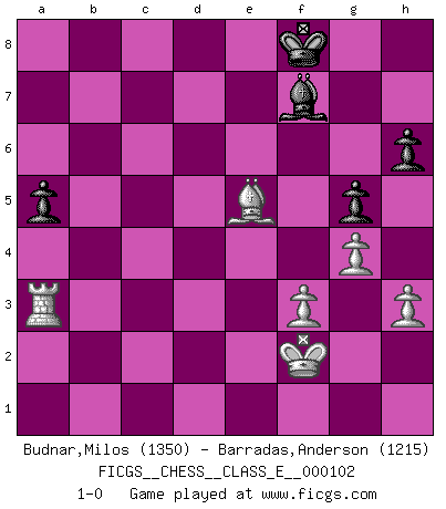 Last move : 1-0 2009 May 12 19:32:13 [Event "FICGS__CHESS__CLASS_E__000102"] [Site "FICGS"] [Date "2009.03.18"] [Round "1"] [White "Budnar,Milos"] [Black "Barradas,Anderson"] [Result "1-0"] [WhiteElo "1350"] [BlackElo "1215"] 1.e4 c5 2.d4 cxd4 3.Qxd4 Nc6 4.Qe3 e5 5.c3 h6 6.Bb5 a6 7.Bxc6 dxc6 8.Nf3 Nf6 9.h3 Bd6 10.O-O Bc7 11.Re1 Bb6 12.Qe2 O-O 13.Nbd2 Be6 14.Nxe5 Bc7 15.Ndf3 Bxe5 16.Nxe5 Re8 17.Bf4 g5 18.Red1 Qc7 19.Bh2 Qe7 20.Rd2 Rad8 21.f3 Rxd2 22.Qxd2 Rd8 23.Qe3 Nd7 24.Nxd7 Rxd7 25.a4 f6 26.e5 Rd5 27.Re1 Kf7 28.exf6 Kxf6 29.c4 Rd8 30.b3 b5 31.Qe5+ Kf7 32.Qc7 Rd7 33.Qe5 Rd3 34.Re3 Rd1+ 35.Kf2 Ra1 36.axb5 cxb5 37.Qxa1 Qb4 38.Qe1 Qc5 39.Qa1 bxc4 40.bxc4 Bxc4 41.Qh8 Kg6 42.g4 a5 43.Qe8+ Bf7 44.Qe4+ Kg7 45.Be5+ Kg8 46.Qa8+ Qf8 47.Qxf8+ Kxf8 48.Ra3 1-0 Sicilian : Smith-Morra gambit Kingside Castling by player White (move 10) Kingside Castling by player Black (move 12) Player White won this chess game. Follow this game move after move (download)The only thing Chess players have in common is Chess. (Lodewijk Prins) Garry Kasparov war erst in der Großmeister-Organisation GMA, dann in der Profischach-Vereinigung PCA, zum Schluss kehrte er wieder in den Schoß der FIDE zurück. Aber gut, manche Leute sind flexibel (Viswanathan Anand) Las ideas audaces son como las piezas del Ajedrez que avanzan hacia adelante. Ellas pueden ser vencidas, pero también pueden iniciar una partida victoriosa. (Goethe) Ce n'est pas pour s'amuser qu'il joue aux échecs : il célèbre un culte. (Vladimir Nabokov) Thibault, I ask for draw. Game 13876. - Sorry Ilmars, you won. (FICGS chat)