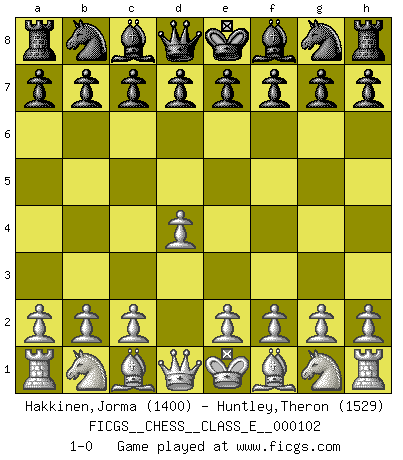 Last move : 1-0 2009 March 19 12:23:29 [Event "FICGS__CHESS__CLASS_E__000102"] [Site "FICGS"] [Date "2009.03.18"] [Round "1"] [White "Hakkinen,Jorma"] [Black "Huntley,Theron"] [Result "1-0"] [WhiteElo "1400"] [BlackElo "1529"] 1.d4 1-0 Queen's pawn Player White won this chess game. Follow this game move after move (download)Fischer is under obligation to nobody. (Joseph Platz) Schachspieler können ausgezeichnet Varianten am Schachbrett berechnen, aber nicht im realen Leben. Zu stark ist der Individualismus im Schach ausgeprägt, und für viele ist ein kleiner momentaner persönlicher Vorteil wichtiger als ein weit größerer Vorteil von morgen. (Anatoly Karpov) ¿Que sería del Ajedrez sin errores graciosos?. (Kurt Richter) La victoire dans une partie d'Echecs appartient la plupart du temps à celui qui voit un peu plus loin que l'adversaire. (Lasker) Are you threatening me, Master Jedi ? (Chancellor Palpatine in Star Wars ep.3)