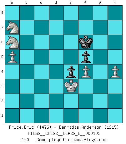 Last move : 1-0 2009 May 5 4:6:56 [Event "FICGS__CHESS__CLASS_E__000102"] [Site "FICGS"] [Date "2009.03.18"] [Round "1"] [White "Price,Eric"] [Black "Barradas,Anderson"] [Result "1-0"] [WhiteElo "1476"] [BlackElo "1215"] 1.e4 c5 2.Nf3 e6 3.d4 cxd4 4.Nxd4 Bc5 5.Nb3 Bb6 6.Qg4 Qf6 7.Qf4 Qxf4 8.Bxf4 Nc6 9.Bd6 Nf6 10.e5 Ne4 11.f3 Nxd6 12.exd6 Nd4 13.Na3 Nf5 14.O-O-O Bc5 15.Nxc5 b6 16.Na6 Ne3 17.Nc7+ Kd8 18.Nxa8 Nxd1 19.Kxd1 Bb7 20.Nc7 f5 21.Ba6 Bxa6 22.Nxa6 Kc8 23.Nb5 Kb7 24.Nbc7 Kc6 25.Re1 Kxd6 26.f4 h6 27.b4 g5 28.g3 gxf4 29.gxf4 Rg8 30.Kd2 h5 31.c4 h4 32.c5+ bxc5 33.bxc5+ Kc6 34.a4 h3 35.Re2 Rg2 36.Ke3 d5 37.cxd6 Kxd6 38.Rxg2 hxg2 39.Kf2 g1Q+ 40.Kxg1 Kc6 41.a5 Kd6 42.Kf2 e5 43.Ke3 e4 44.h4 Ke7 45.Nb5 Kf6 46.Nxa7 1-0 Sicilian defense Queenside Castling by player White (move 14) Promotion Queen by player Black (move 39) 10 pieces endgame at move 40 : White KNNPPP , Black KPPP WHITE : King + 2 Knights 3 Pawns BLACK : King + 3 Pawns 9 pieces endgame at move 46 : White KNNPPP , Black KPP WHITE : King + 2 Knights 3 Pawns BLACK : King + 2 Pawns Player White won this chess game. Follow this game move after move (download)Any material change in a position must come about by mate, a capture, or a Pawn promotion. (Purdy) Wie ich sie so einen nach dem anderen nieder mähte wurde meine Überlegenheit offensichtlich. (José Raúl Capablanca) Tu sabes, camarada Pachman, no disfruto el ser un Ministro, preferería jugar al Ajedrez como tu. (Che Guevara) Des points faibles ou des trous dans la position de l'adversaire doivent être occupés par des pièces et non pas par des pions. (Siegbert Tarrasch) Memory is a way of holding onto the things you love, the things you are, the things you never want to lose. (from the television show: The Wonder Years)