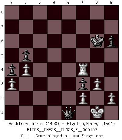 Last move : 0-1 2009 June 25 8:50:3 [Event "FICGS__CHESS__CLASS_E__000102"] [Site "FICGS"] [Date "2009.03.18"] [Round "1"] [White "Hakkinen,Jorma"] [Black "Higuita,Henry"] [Result "0-1"] [WhiteElo "1400"] [BlackElo "1501"] 1.d4 d5 2.Nf3 Nc6 3.Nc3 e6 4.a3 h6 5.e4 a6 6.Bd3 dxe4 7.Bxe4 Bd7 8.O-O Nf6 9.Be3 Nxe4 10.Nxe4 Be7 11.c4 Bf6 12.b4 b5 13.c5 a5 14.Qd2 a4 15.Rfd1 Qe7 16.Nxf6+ Qxf6 17.d5 Ne5 18.Nxe5 Qxe5 19.dxe6 Bxe6 20.Bf4 Qf6 21.Bxc7 O-O 22.Bd6 Rfd8 23.Qf4 Qg6 24.g3 Rac8 25.Be7 Re8 26.Bd6 Bh3 27.Rd2 Re4 28.Rf1 Rxf4 29.Bxf4 Bxf1 30.Kxf1 Re8 31.Rd6 Qb1+ 32.Kg2 Re1 33.c6 g5 34.c7 Rc1 35.Rd8+ Kh7 36.c8Q Rxc8 37.Rxc8 gxf4 38.Rc7 Qe4+ 39.Kg1 f3 40.Rxf7+ Kg6 41.Rf4 Qe1+ 0-1 Queen's pawn game, Chigorin variation Kingside Castling by player White (move 8) Kingside Castling by player Black (move 21) Promotion Queen by player White (move 36) Player Black won this chess game. Follow this game move after move (download)Place the contents of the Chess box in a hat, shake them up vigorously, pour them on the board from a height of two feet, and you get the style of Steinitz. (H. E. Bird) Frage des Reporters: -Welche besonderen Umstände rechtfertigen das Anhalten der Uhren während einer Turnierpartie? Antwort: -Einen Fotographen zu strangulieren. (Siegbert Tarrasch) Un jugador que es sorprendido, esta derrotado a medias. (Proverbio) La guerre est enfant de la passion, la passion est enfant du narcissisme et le narcissisme est l'enfant. (...) Une autre partie ? (Thibault de Vassal) The real voyage of discovery consists not in seeking new lands but in seeing with new eyes. (Marcel Proust)