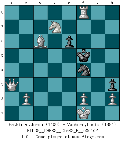 Last move : 1-0 2009 June 21 20:34:37 [Event "FICGS__CHESS__CLASS_E__000102"] [Site "FICGS"] [Date "2009.03.18"] [Round "1"] [White "Hakkinen,Jorma"] [Black "Vanhorn,Chris"] [Result "1-0"] [WhiteElo "1400"] [BlackElo "1354"] 1.d4 b6 2.c4 Ba6 3.e4 c5 4.Nf3 g6 5.Bd3 Bh6 6.O-O Nc6 7.d5 f5 8.dxc6 dxc6 9.Nc3 fxe4 10.Bxe4 Bxc4 11.Qxd8+ Kxd8 12.Bxc6 Bxf1 13.Bxa8 Bxc1 14.Rxc1 Bc4 15.Bc6 h5 16.Ne5 Nf6 17.Nxc4 Kc7 18.Bf3 Rd8 19.Nb5+ Kc8 20.Nxa7+ Kb8 21.Nc6+ Kc7 22.Nxd8 Kxd8 23.Nxb6 h4 24.Rxc5 e6 25.a4 g5 26.a5 g4 27.Rc8+ Ke7 28.Bc6 Nh5 29.a6 h3 30.a7 Nf4 31.gxh3 gxh3 32.a8Q Ne2+ 33.Kf1 Nf4 34.Qa3+ Kf6 35.Nd7+ Kf5 36.Rf8+ 1-0 Queen's pawn : English defense Kingside Castling by player White (move 6) Promotion Queen by player White (move 32) Player White won this chess game. Follow this game move after move (download)A thorough understanding of the typical mating continuations makes the most complicated sacrificial combinations leading up to them not only not difficult, but almost a matter of course. (Siegbert Tarrasch) Es ist besser die Steine des Gegners zu opfern. (Savielly Grigorievitsch Tartakower) Si el Ajedrez es una ciencia, es la mas inexacta. Si el Ajedrez es un arte, es demasiado inexacto para ser visto como tal. Si el Ajedrez es un deporte, es demasiado esotérico. Si el Ajedrez es un juego, es demasiado exigente para ser solo un juego. Si el Ajedrez es una aventura, es una muy demandante. Si el Ajedrez es una pasión, es una muy gratificante. Si el Ajedrez es la vida, es una muy triste. (Anónimo) Seul un grand joueur sait à quel point il joue faiblement. (Xavier Tartacover) There are more things in heaven and earth than practically anywhere else. (Unknown)