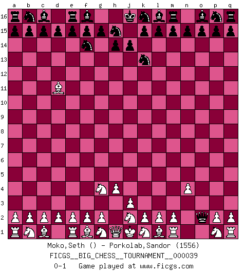 Last move : 0-1 2009 March 28 1:36:49 [Event "FICGS__BIG_CHESS__TOURNAMENT__000039"] [Site "FICGS"] [Date "2009.03.20"] [Round "1"] [White "Moko,Seth"] [Black "Porkolab,Sandor"] [Result "0-1"] [WhiteElo ""] [BlackElo "1556"] 1.h2-g4 j15-k13 2.n2-n4 h16-o10 3.o1-d11 g16-f14 4.h3-h4 o10-o2 0-1 Follow this game move after move (download)We like to think. (Gary Kasparov) Auf Remis zu spielen ist gewissermaßen ein Verbrechen gegen das Schachspiel. (Mikhail Nekhemyevich Tal) Solo puedes ser bueno en el Ajedrez si amas al juego. (Bobby Fischer) Si le désir cupide (et stupide) de gagner est une inépuisable source de souffrance, une combinaison brillante sur l'échiquier est une découverte : le coquelicot qui s'épanouit lorsque apparaît la Voie Lactée. (Arrabal) It's unlucky to be superstitious. (Dave Enteles)