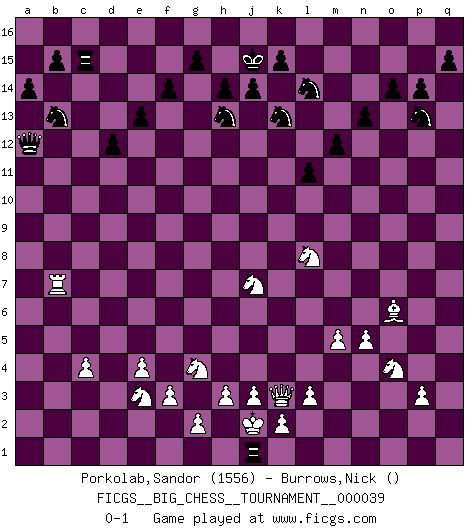 Last move : 0-1 2009 April 21 23:3:40 [Event "FICGS__BIG_CHESS__TOURNAMENT__000039"] [Site "FICGS"] [Date "2009.03.20"] [Round "1"] [White "Porkolab,Sandor"] [Black "Burrows,Nick"] [Result "0-1"] [WhiteElo "1556"] [BlackElo ""] 1.j2-k4 j15-h13 2.h1-o7 p16-o14 3.o7-c7 h15-j13 4.c7-c15 h16-o10 5.h2-g4 o10-o2 6.p1-o3 o2-f10 7.b1-c3 b16-c14 8.c15-l7 k16-l14 9.g1-f3 n15-n13 10.m2-m4 e15-e13 11.e2-e4 d15-d13 12.d2-d4 f16-b12 13.l1-m2 m15-m13 14.k1-h2 m13-m12 15.f1-c4 o14-m13 16.n2-n3 l16-n14 17.o1-g8 g16-j15 18.c1-k8 o16-f8 19.l2-l3 q16-n16 20.n3-n4 m13-o12 21.m2-o4 f15-f14 22.q1-o1 n14-g8 23.c4-g8 o12-n14 24.o4-p3 o15-o14 25.l7-f7 n14-l13 26.o3-n5 c16-f13 27.f3-e5 f13-c10 28.f7-f3 c10-m1 29.o1-m1 f10-b6 30.g8-b3 b6-d4 31.a1-d1 d4-b6 32.n5-l6 d13-d12 33.f3-f7 b6-h12 34.d1-d9 h12-j12 35.m1-o1 j13-g12 36.e5-g6 f8-k12 37.e1-d1 g12-e11 38.d9-j9 j12-n8 39.k8-n5 k12-h10 40.j9-p9 h10-n5 41.p3-n5 m16-m15 42.f7-h7 n8-n12 43.h7-j6 l13-n14 44.f2-f3 n14-p13 45.h2-k3 a15-a14 46.k3-j5 c14-e15 47.b3-a4 e16-c16 48.j6-q13 n16-m16 49.q13-k7 e15-c14 50.p9-p12 n12-q9 51.p12-p7 c14-d16 52.d1-d7 c16-c3 53.b2-c3 q9-a9 54.j1-j2 a9-a4 55.d7-c7 a4-c2 56.g4-e3 c2-a2 57.j5-g4 d16-c14 58.k7-k10 a2-m13 59.p2-p3 m13-q9 60.j2-h2 q9-q2 61.h2-j2 q2-n2 62.o1-o4 b12-e9 63.c7-b7 a16-b16 64.p7-k7 j15-k13 65.k10-k9 n2-c12 66.c3-c4 c12-f15 67.k9-e9 j16-j15 68.o4-o8 l14-j13 69.k7-k10 l15-l13 70.e9-a9 f15-g14 71.g6-j7 m16-c16 72.o8-b8 e11-c10 73.k10-c10 g14-c10 74.b8-b10 c10-c12 75.n5-o4 c16-c15 76.b7-c7 c12-n2 77.n4-n5 m15-m16 78.a9-k9 l13-l12 79.o4-p5 l12-l11 80.p5-q4 n2-l4 81.j2-j1 l4-p8 82.l6-n7 p8-l12 83.n7-l8 m16-c16 84.c7-b7 c14-a15 85.k9-e14 a15-b13 86.e14-k9 c15-c10 87.b10-b9 c10-o10 88.q4-o6 c16-c10 89.k4-m5 c10-a10 90.b9-a9 a10-a9 91.k9-a9 b16-c16 92.a9-a13 l12-e12 93.m5-o4 e12-d13 94.j1-j2 o10-a10 95.a13-f8 j13-l14 96.f8-f13 c16-c15 97.f13-f7 p15-p14 98.f7-f5 a10-a1 99.m4-m5 d13-c12 100.f5-k5 c12-a12 101.k5-k3 a1-j1 0-1 Follow this game move after move (download)Chess is imagination. (David Bronstein) Sicherlich können nur Meister einen Stil haben. Daß ein nicht-Meister auch nur ein einziges Mal in seinem Leben eine Partie folgerecht durchführte, habe ich niemals bemerkt. (Emanuel Lasker) El Rey es una pieza de pelea. ¡Usenlo!. (Wilhelm Steinitz) On est toujours la mazette de quelqu'un d'autre. (Anonyme) Perfection is achieved, not when there is nothing more to add, but when there is nothing left to take away. (Antoine de Saint-Exupéry)