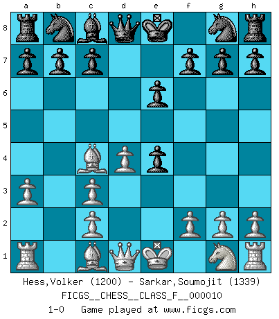 Last move : 1-0 2006 October 17 0:24:55 [Event "FICGS__CHESS__CLASS_F__000010"] [Site "FICGS"] [Date "2006.09.05"] [Round "1"] [White "Hess,Volker"] [Black "Sarkar,Soumojit"] [Result "1-0"] [WhiteElo "1200"] [BlackElo "1339"] 1.e4 e6 2.d4 d5 3.Nc3 Bb4 4.a3 Bxc3+ 5.bxc3 dxe4 6.Bc4 1-0 This chess game has been lost on time (started : 2006.09.05 1:26:26) French : Winawer (Nimzovich) variation Player White won this chess game. Follow this game move after move (download)In Chess, as it is played by masters, chance is practically eliminated. (Emanuel Lasker) Ich moechte nie einem Club beitreten, der Leute wie mich als Mitglieder aufnimmt. (Woody Allen) Nada excita más a Grandes Maestros aburridos que una novedad teórica. (Dominic Lawson) Comme les marins qui ont mille raisons différentes d'aller en mer, les joueurs d'échecs en ont tout autant avant de s'installer devant une table et jouer... (Vincent Bertignac, philosophe) Art is not a thing, it is a way. (Elbert Hubbard)