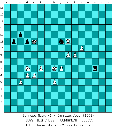 Last move : 1-0 2009 April 4 3:1:33 [Event "FICGS__BIG_CHESS__TOURNAMENT__000039"] [Site "FICGS"] [Date "2009.03.20"] [Round "1"] [White "Burrows,Nick"] [Black "Carrizo,Jose"] [Result "1-0"] [WhiteElo ""] [BlackElo "1701"] 1.e2-e4 p16-o14 2.j2-h4 b16-c14 3.p1-o3 g15-g13 4.b1-c3 f15-f13 5.m2-m4 d15-d14 6.f1-b5 e15-e13 7.d2-d3 f13-f12 8.f2-f4 n15-n14 9.l1-p5 k15-k13 10.n2-n3 l16-k15 11.l2-l4 m15-m13 12.g1-f3 l15-l13 13.k1-l3 j14-j13 14.l4-l5 l13-l12 15.f4-f5 h14-h13 16.g2-g4 j13-j12 17.g4-g5 h13-h12 18.g5-g6 h15-j13 19.o1-m3 j13-k11 20.l3-j4 k16-h15 21.j4-k6 c16-f13 22.f3-g5 o16-n15 23.g5-h7 f16-k12 24.c1-f4 h15-j13 25.h2-j4 g16-f14 26.j1-j2 m13-m12 27.o3-n5 j15-h13 28.h1-f3 m12-m11 29.o2-o4 h16-o10 30.e1-l1 j16-h15 31.f3-m9 k15-o11 32.m9-o7 n15-l13 33.o7-o10 l13-o10 34.k2-k4 f13-h11 35.b5-h11 j12-h11 36.j4-h6 h15-h14 37.j3-j4 h13-g11 38.j4-j5 e16-j16 39.h4-j6 j13-g12 40.j6-k8 j16-j14 41.h3-h4 a16-j16 42.m4-m5 k12-m10 43.n5-m7 f14-h13 44.n3-n4 h13-j11 45.o4-o5 j11-h9 46.p5-o4 g12-f10 47.p2-p4 c14-d12 48.q2-q4 d12-f13 49.c3-d5 h9-k8 50.o4-k8 m10-k8 51.m7-k8 c15-c14 52.p4-p5 g11-h9 53.k8-h9 f10-h9 54.d5-f6 f13-g11 55.f6-g8 o14-n12 56.h6-j4 d14-d13 57.q4-q5 e13-e12 58.j2-k3 e12-e11 59.n4-n5 f12-f11 60.o5-o6 f11-f10 61.m3-o5 g13-g12 62.p5-p6 m16-m13 63.q5-q6 f10-f9 64.g8-h6 e11-e10 65.m5-m6 h9-g7 66.f5-f6 g7-j6 67.h4-h5 j6-h8 68.g6-g7 h8-g10 69.n5-n6 k11-j9 70.h7-j9 g10-j9 71.n6-n7 n12-l11 72.o6-o7 l11-j10 73.e4-e5 j10-g9 74.j5-j6 o10-n11 75.a1-f1 k13-k12 76.l5-l6 k12-k11 77.m6-m7 k11-k10 78.m7-m8 l12-l11 79.l6-l7 n14-n13 80.d3-d4 n13-n12 81.h6-g4 o15-o13 82.f4-n11 m11-m10 83.g4-j5 j9-g8 84.j5-l6 q15-q14 85.n11-q8 p15-p13 86.q8-m4 g9-f7 87.o5-m3 o13-o12 88.e5-e6 f7-d6 89.n7-n8 n12-n11 90.k6-m7 l11-l10 91.b2-b3 d6-b5 92.f6-f7 g8-h10 93.f1-f4 h10-j8 94.c2-c4 b5-c7 95.d4-d5 j8-g7 96.j4-g3 c7-d9 97.m4-a15 g7-j8 98.a15-k6 j8-k6 99.m7-k6 d9-f8 100.g3-f5 j16-a16 101.a2-a4 a16-a12 102.l1-g1 m13-g13 103.g1-g3 g11-h9 104.m1-g1 g12-g11 105.k4-k5 l10-l9 106.m8-m9 o11-n12 107.k6-m5 a12-b12 108.f4-f3 q16-k16 109.f5-g7 h9-f10 110.m3-k1 k10-k9 111.k1-f5 n12-m13 112.k5-k6 m13-j16 113.k6-k7 j16-e12 114.m5-k4 j14-k14 115.q1-q4 g13-j13 116.f5-k1 f10-d9 117.k1-n4 d9-c7 118.k4-h3 c7-a6 119.h3-g5 a6-c5 120.n4-q1 f8-d9 121.g5-e4 c5-b7 122.g7-f5 d9-f8 123.l6-j5 f8-h9 124.j5-g6 k9-k8 125.l7-l8 e12-j16 126.f5-h4 j16-n12 127.e4-f6 k14-j14 128.q1-l6 b7-c5 129.l6-f1 c5-b7 130.f1-d3 n12-m13 131.h4-k5 b7-c9 132.d3-c2 b12-b4 133.g6-h8 c9-a8 134.h8-k9 a8-b6 135.q4-g4 b6-c8 136.f6-h7 h11-h10 137.k9-h8 j14-j15 138.h8-g10 b4-b12 139.h7-f8 h9-f8 140.g10-f8 k16-e16 141.c2-k9 m13-l14 142.k5-h6 c8-e9 143.h6-j8 j15-k15 144.j8-h10 j13-l13 145.h10-j8 e16-e15 146.j8-g9 k15-k10 147.k3-j4 e9-d11 148.g9-j10 d11-f10 149.j10-g11 h12-g11 150.g4-g11 l14-j12 151.k9-j8 k10-h10 152.g3-g9 l13-k13 153.j8-g10 j12-g10 154.g11-g10 h10-g10 155.g9-g10 b12-f12 156.g10-g14 h14-h13 157.g14-q14 f12-g12 158.f3-g3 d13-d12 159.q14-f14 g12-g3 160.g1-g3 k13-k10 161.f14-f13 h13-h14 162.f13-p13 e15-e12 163.q6-q7 d12-d11 164.q7-q8 k10-k11 165.q8-q9 o12-o11 166.q9-q10 e12-q12 167.g3-q3 e10-e9 168.f8-g6 n11-n10 169.q10-q11 n10-m9 170.n8-m9 o11-o10 171.p13-f13 f10-g12 172.f13-f9 q12-q11 173.q3-q11 k11-q11 174.f9-e9 q11-p11 175.e9-e14 h14-g13 176.e14-o14 p11-p6 177.o14-o10 p6-p3 178.o10-m10 p3-b3 179.m10-l10 b3-b4 180.g6-e5 b4-a4 181.l10-l9 a4-a1 182.j4-j5 a1-e1 183.e5-d7 e1-c1 184.c4-c5 c1-d1 185.d5-d6 g13-f12 186.l9-k9 d1-o1 187.k9-k8 o1-o7 188.j5-h6 c14-c13 189.k8-k15 b15-b14 190.h6-h7 c13-c12 191.j6-j7 f12-e11 192.k7-k8 b14-b13 193.l8-l9 b13-b12 194.m9-m10 b12-b11 195.k8-k9 g12-j11 196.k15-k11 1-0 Follow this game move after move (download)When I have White, I win because I am white; When I have Black, I win because I am Bogolyubov. (Bogolyubov) Die Fehler sind da, Sie warten nur darauf gemacht zu werden. (Savielly Grigorievitsch Tartakower) No puedes jugar al Ajedrez si eres de corazón noble. (Proverbio Francés) Les Echecs sont affaire de jugement sensible. Savoir quand frapper et quand esquiver. (Fischer) If things go wrong, don't go with them. (Roger Babson)