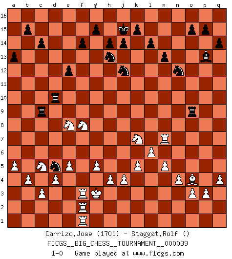 Last move : 1-0 2009 July 24 3:14:26 [Event "FICGS__BIG_CHESS__TOURNAMENT__000039"] [Site "FICGS"] [Date "2009.03.20"] [Round "1"] [White "Carrizo,Jose"] [Black "Staggat,Rolf"] [Result "1-0"] [WhiteElo "1701"] [BlackElo ""] 1.b1-c3 h15-g13 2.n2-n4 j15-k13 3.o2-o3 m15-m13 4.j2-k4 n15-n13 5.h1-m5 p16-o14 6.m5-n5 e15-e13 7.n5-n13 o16-m14 8.n13-k10 f16-e15 9.d2-d3 q16-n16 10.e2-e4 d15-d13 11.o1-f9 g16-j15 12.m2-m4 k16-h15 13.l1-o4 b16-c14 14.p1-n2 c16-h11 15.f9-g8 l16-p12 16.f1-e2 m14-j11 17.k10-h8 p12-e2 18.g1-e2 j15-h13 19.e2-g3 j11-c5 20.c1-e3 c5-l13 21.h2-j4 l13-m12 22.h8-h7 h13-j11 23.k1-h2 h16-k14 24.h2-k3 j16-j15 25.j1-h2 j11-g10 26.g8-f9 g10-j9 27.h7-d7 h11-f9 28.d7-f9 j9-h11 29.m1-m3 n16-n12 30.m3-l3 m16-m15 31.q1-m1 e16-n16 32.m4-m5 n16-n14 33.n2-m4 a16-n16 34.m4-n6 m12-q8 35.l3-l8 n12-n9 36.f9-b13 n16-b16 37.b13-d13 k14-p9 38.p2-p3 h15-f14 39.d13-l6 b16-d16 40.n6-p5 p9-o9 41.l6-o9 n9-o9 42.l8-q8 g13-j12 43.p5-n6 f14-h13 44.l2-l4 q15-q14 45.l4-l5 d16-d9 46.l5-l6 e15-k10 47.k3-l5 d9-b9 48.a1-b1 o14-n12 49.c3-a4 n14-o14 50.b2-b3 f15-f14 51.a4-c5 m15-n15 52.d3-d4 n12-l13 53.c2-c3 n15-n9 54.a2-a4 k10-m12 55.q8-q7 c14-d12 56.b3-b4 d12-f11 57.a4-a5 l13-k11 58.l5-m7 n9-f9 59.k4-h5 m12-k14 60.k2-k4 l15-l14 61.k4-k5 o14-o10 62.j4-l5 a15-a13 63.j3-j4 o10-c10 64.h5-g7 f9-f7 65.g7-e6 f7-f9 66.e6-d8 k14-d8 67.g3-h5 c10-g10 68.g2-g3 k11-j9 69.f2-f4 e13-e12 70.h3-h4 h11-g9 71.l5-j6 g10-c10 72.g3-g4 g9-f7 73.f4-f5 j9-g8 74.e4-e5 f7-h6 75.h2-h3 f9-g9 76.e1-g1 c10-g10 77.f5-f6 b9-e9 78.b1-f1 g8-f6 79.h5-f6 d8-f6 80.e3-h6 f6-j9 81.h6-e9 f11-e9 82.c5-e6 g10-c10 83.f1-f3 e9-g8 84.n6-m8 o9-m9 85.m8-k7 j9-m12 86.q7-p7 g9-c9 87.e6-c5 g8-e7 88.p7-o7 k13-m14 89.m7-k8 m9-d9 90.o7-m7 m12-o14 91.k8-h7 e7-d5 92.h7-f8 d9-q9 93.q2-q4 q9-f9 94.g1-f1 c10-f10 95.h3-g3 f10-d10 96.f1-f2 f9-o9 97.m1-f1 o14-p13 98.g4-g5 c15-c14 99.j6-g7 m14-n12 100.g7-e8 1-0 Follow this game move after move (download)A chess genius has died; a loss for humanity. (Viktor Kortchnoi, about Bobby Fischer's death) Aljechin war kein Nazi. Er war ein Opportunist. Ein schrecklicher Mann. Er liebte Geld über alles und würde für Geld ein Jude, ein Katolik oder ein Protestant werden. (Miguel Najdorf) Preferería tener un Peón que un dedo. (Reuben Fine) Toutes les manuvres exécutées sur une colonne ouverte ont pour but ultime l'intrusion définitive sur la septième ou la huitième rangée, en plein cur de la position ennemie. (Aaron Nimzovitch) Games, world of games... There's always an opponent, and there's always a victim. (Revolver, movie)