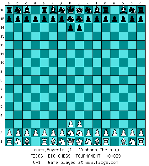 Last move : 0-1 2009 March 21 1:48:21 [Event "FICGS__BIG_CHESS__TOURNAMENT__000039"] [Site "FICGS"] [Date "2009.03.20"] [Round "1"] [White "Louro,Eugenio"] [Black "Vanhorn,Chris"] [Result "0-1"] [WhiteElo ""] [BlackElo ""] 0-1 Follow this game move after move (download)I still hope to kill Fischer. (Boris Spassky) Über die Verhaftung Bobby Fischers: Warum es die Bush-Administration für nötig befindet einen 61 Jahre alten Mann zu hetzten, der für niemanden ausser sich selbste eine Gefahr darstellt ist ein Rätsel. (Nigel Short) El Ajedrez es en su esencia, un juego. En su forma, un arte. Y en su ejecución, una ciencia. (Baron Tassilo) Même si l'adversaire joue le coup analysé précédemment, recommencez l'analyse en voyant la nouvelle position. Première règle de Blumenfeld The beginning of wisdom is silence. The second step is listening. (Unknown)