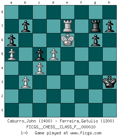 Last move : 1-0 2006 November 27 13:43:41 [Event "FICGS__CHESS__CLASS_F__000010"] [Site "FICGS"] [Date "2006.09.05"] [Round "1"] [White "Caburro,John"] [Black "Ferreira,Getulio"] [Result "1-0"] [WhiteElo "1400"] [BlackElo "1300"] 1.d4 Nf6 2.Nc3 g6 3.e4 d6 4.Nf3 c6 5.Be2 Bg7 6.O-O O-O 7.h3 Nbd7 8.Be3 Qb6 9.Rb1 Qa5 10.Qd2 Qc7 11.Rfd1 a6 12.Bh6 e5 13.Bxg7 Kxg7 14.d5 c5 15.a4 Ne8 16.Nh2 Kg8 17.Rf1 Ng7 18.f4 exf4 19.Rxf4 Ne5 20.Rbf1 f5 21.Rh4 Ne8 22.g4 Qe7 23.g5 f4 24.Rhxf4 Qxg5+ 25.Kh1 Rxf4 26.Rxf4 Qe7 27.Qe3 Bd7 28.Ng4 Bxg4 29.Bxg4 Nxg4 30.Rxg4 Nf6 31.Qg5 Re8 32.Rf4 Nh5 33.Qxe7 Rxe7 34.Rf3 Kg7 35.a5 Nf6 36.Kg2 Nd7 37.Re3 Ne5 38.b3 Nd7 39.Na4 Ne5 40.Nb6 Rc7 41.c4 Nd7 42.Nxd7 Rxd7 43.e5 dxe5 44.Rxe5 Kf6 45.Re6+ Kf5 46.Kf3 Rf7 47.Ke3 Rd7 48.Re8 Kg5 49.Ke4 Kh4 50.Ke5 Kxh3 51.Ke6 Rg7 52.Re7 1-0 Comment by player 2 : Getulio Ferreira : Congratulations on winning this game and the tourney. Greetings from Brazil, Getulio Queen's pawn game Kingside Castling by player White (move 6) Kingside Castling by player Black (move 6) Player White won this chess game. Follow this game move after move (download)The isolated Pawn casts gloom over the entire chessboard. (Aaron Nimzovich) Ich hatte Angst gegen einen russischen Großmeister zu verlieren, und er befürchtete gegen einen kleinen Jungen zu verlieren. (über ein Remis gegen Juri Awerbach). (Robert James Fischer) El Ajedrez es realmente noventa y nueve por ciento calculación. (Soltis) Horreur, mais aussi harmonie suprême : qu'y avait-il en effet au monde en dehors des échecs ? Le brouillard, l'inconnu, le non-être... (Vladimir Nabokov) I've lost money so fast in these clubs it's left me reeling. I've read every poker book ever written, but the only way to get better at the game is to go out and play with people who are really good. The problem is, you stand to lose a lot of money doing it. (Matt Damon)