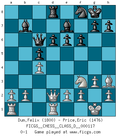 Last move : 0-1 2009 August 18 20:58:36 [Event "FICGS__CHESS__CLASS_D__000117"] [Site "FICGS"] [Date "2009.03.21"] [Round "1"] [White "Dum,Felix"] [Black "Price,Eric"] [Result "0-1"] [WhiteElo "1800"] [BlackElo "1476"] 1.Nf3 Nf6 2.c4 e6 3.g3 b6 4.Bg2 Bb7 5.O-O Be7 6.Nc3 O-O 7.d4 Ne4 8.Qc2 Nxc3 9.Qxc3 c5 10.dxc5 bxc5 11.Bf4 d6 12.Rfd1 Qb6 13.Qb3 Rd8 14.Bg5 f6 15.Bd2 Nd7 16.Qe3 Nf8 17.Bc3 Rd7 18.Qd2 a5 19.Bh3 Rad8 20.Bxa5 Qc6 21.Bxd8 Rxd8 0-1 This chess game has been lost on time (started : 2009.03.21 12:5:55) Reti Opening Kingside Castling by player White (move 5) Kingside Castling by player Black (move 6) Player Black won this chess game. Follow this game move after move (download)A bad day of Chess is better than any good day at work. (Anonymous) Ihnen, Herr Lasker, habe ich nur drei Worte zu sagen: Schach und matt. (Siegbert Tarrasch) Coloca el contenido del tablero de Ajedrez en un sombrero, agita las piezas vigorosamente, derrámalas en el tablero desde una altura de medio metro y así obtienes el estilo de Wilhelm Steinitz. (H. E. Bird) Tous ces prétendus hommes politiques sont les pions, les Cavaliers, les Tours ou les Fous d'une partie d'échecs qui se jouera tant qu'un hasard ne renversera pas l'échiquier. (Honoré de Balzac) There are more things in heaven and earth than practically anywhere else. (Unknown)