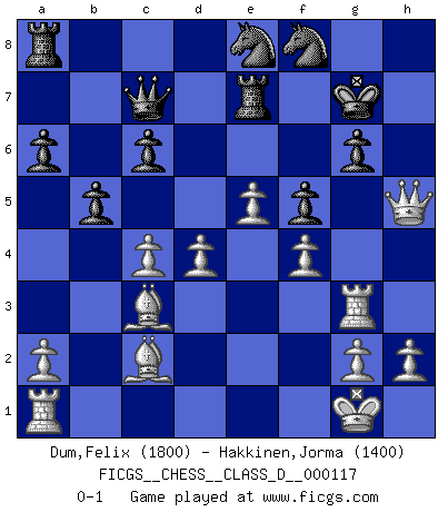 Last move : 0-1 2009 September 10 9:53:14 [Event "FICGS__CHESS__CLASS_D__000117"] [Site "FICGS"] [Date "2009.03.21"] [Round "1"] [White "Dum,Felix"] [Black "Hakkinen,Jorma"] [Result "0-1"] [WhiteElo "1800"] [BlackElo "1400"] 1.Nf3 c6 2.c4 Nf6 3.d4 d5 4.e3 Bf5 5.Nc3 Nbd7 6.b3 e6 7.Nh4 Bb4 8.Bd2 Bxc3 9.Bxc3 O-O 10.Nxf5 exf5 11.Bd3 Re8 12.Bxf5 g6 13.Bc2 a6 14.O-O Qc7 15.Qe2 dxc4 16.bxc4 Re7 17.e4 h5 18.e5 Ne8 19.f4 f5 20.Rf3 b5 21.Rg3 Kg7 22.Qxh5 Nf8 0-1 This chess game has been lost on time (started : 2009.03.21 12:5:55) Reti Opening Kingside Castling by player Black (move 9) Kingside Castling by player White (move 14) Player Black won this chess game. Follow this game move after move (download)The battle for the ultimate truth will never be won. And that's why Chess is so fascinating. (Hans Kmoch) Um dein Spiel zu verbessern musst du zuallererst das Endspiel studieren, denn diese kann unabhängig studiert werden. Die Eröffnung und das Mittelspiel müssen immer in Bezug gesetzt werden zum Endspiel. (José Raúl Capablanca) El Ajedrez, como la música, como el amor, tiene el poder de hacer feliz a la gente. (Siegbert Tarrasch) Même si l'adversaire joue le coup analysé précédemment, recommencez l'analyse en voyant la nouvelle position. Première règle de Blumenfeld Sometimes it pays to stay in bed in Monday, rather than spending the rest of the week debugging Monday's code. (Dan Salomon)