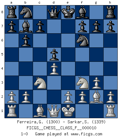 Last move : 1-0 2006 October 15 18:22:8 [Event "FICGS__CHESS__CLASS_F__000010"] [Site "FICGS"] [Date "2006.09.05"] [Round "1"] [White "Ferreira,Getulio"] [Black "Sarkar,Soumojit"] [Result "1-0"] [WhiteElo "1300"] [BlackElo "1339"] 1.c4 Nf6 2.Nc3 e6 3.Nf3 b6 4.g3 Bb7 5.Bg2 d5 6.cxd5 exd5 7.d4 1-0 This chess game has been lost on time (started : 2006.09.05 1:26:26) English : Queens Indian formation Player White won this chess game. Follow this game move after move (download)Fischer sacrificed virtually everything most of us weakies (to use his term) value, respect, and cherish, for the sake of an artful, often beautiful board game, for the ambivalent privilege of being its greatest master. (Paul Kollar) Der Bart als Geschlechtszeichen mitten im Gesicht ist obszön. Daher gefällt er den Weibern. [Zugegeben, kein Schachzitat, aber unglaublich originell] (Arthur Schopenhauer) El juego de Damas es para vagabundos. (Paul Morphy) Tous ces prétendus hommes politiques sont les pions, les Cavaliers, les Tours ou les Fous d'une partie d'échecs qui se jouera tant qu'un hasard ne renversera pas l'échiquier. (Honoré de Balzac) A belief is an idea the mind possesses, an idea that possesses the mind. (Robert Oxden Bolton)