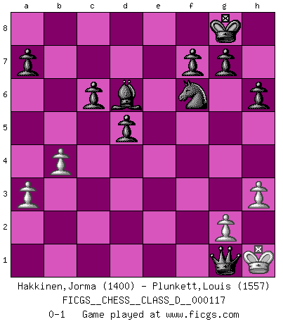 Last move : 0-1 2009 May 18 19:26:21 [Event "FICGS__CHESS__CLASS_D__000117"] [Site "FICGS"] [Date "2009.03.21"] [Round "1"] [White "Hakkinen,Jorma"] [Black "Plunkett,Louis"] [Result "0-1"] [WhiteElo "1400"] [BlackElo "1557"] 1.d4 d5 2.c4 e6 3.Nf3 c5 4.Nc3 Nc6 5.cxd5 exd5 6.Bf4 Nf6 7.e3 cxd4 8.exd4 Bb4 9.a3 Be7 10.Bb5 Bd7 11.Bxc6 bxc6 12.O-O O-O 13.Re1 Re8 14.Qc2 Qb6 15.b4 Bf8 16.Rxe8 Rxe8 17.Ng5 Qxd4 18.Be3 Rxe3 19.fxe3 Qxe3+ 20.Kh1 Qxg5 21.Re1 h6 22.Re2 Bg4 23.Rf2 Bd6 24.h3 Qh4 25.Nd1 Bxd1 26.Qxd1 Qxf2 27.Qg1 Qxg1+ 0-1 Queen's gambit declined Kingside Castling by player White (move 12) Kingside Castling by player Black (move 12) Player Black won this chess game. Follow this game move after move (download)Blessed be the memory of him who gave the world this immortal game. (A. G. Gardiner) Offensichtlich kennt Kasparow nichts anderes als Schach, und ich könnte 500 weitere Spieler dieser Sorte benennen. (Judith Polgar) Con o sin el título, Bobby Fischer fue sin lugar a dudas el mas grande jugador de su época. (Burt Hochberg) Si je n'étais pas joueur d'échecs, je serais le meilleur dans quelque chose d'autre. (Anatoli Karpov) When I took office, only high energy physicists had ever heard of what is called the World Wide Web... Now even my cat has its own page. (Bill Clinton, 1996)