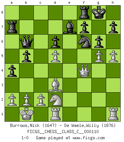 Last move : 1-0 2009 March 30 18:12:17 [Event "FICGS__CHESS__CLASS_C__000110"] [Site "FICGS"] [Date "2009.03.21"] [Round "1"] [White "Burrows,Nick"] [Black "De Waele,Willy"] [Result "1-0"] [WhiteElo "1647"] [BlackElo "1876"] 1.e4 c5 2.Nf3 d6 3.d4 cxd4 4.Nxd4 Nf6 5.Nc3 a6 6.Be3 e5 7.Nb3 Be6 8.Qd2 Nbd7 9.O-O-O Be7 10.f4 Ng4 11.g3 Nxe3 12.Qxe3 b5 13.Kb1 Qb6 14.Qf3 Nf6 15.Nd5 Bxd5 16.exd5 O-O 17.g4 Nd7 18.Bd3 exf4 19.Qe4 Nf6 20.Qxf4 g6 21.h4 a5 22.h5 a4 23.Nd2 Ra7 24.g5 1-0 Sicilian : Najdorf, Byrne (English) attack Queenside Castling by player White (move 9) Kingside Castling by player Black (move 16) Player White won this chess game. Follow this game move after move (download)Pawns: they are the soul of this game, they alone form the attack and defense. (Philidor) Stil? Ich habe keinen Stil! (Anatoly Karpov) No hay precio que no valga la pena por la cabellera del Rey enemigo. (Koblentz) Dieu déplace le joueur, et celui-ci la pièce. Quel Dieu derrière Dieu commence donc la trame ? Arturo Perez-Reverte (prix de littérature policière 1993). Kids, you tried your best and you failed miserably. The lesson is, never try. (Simpsons)
