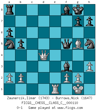 Last move : 0-1 2009 July 30 11:56:43 [Event "FICGS__CHESS__CLASS_C__000110"] [Site "FICGS"] [Date "2009.03.21"] [Round "1"] [White "Zaunercik,Ilmar"] [Black "Burrows,Nick"] [Result "0-1"] [WhiteElo "1743"] [BlackElo "1647"] 1.e4 e5 2.Nf3 Nc6 3.Bb5 a6 4.Ba4 Nf6 5.O-O Be7 6.Re1 b5 7.Bb3 d6 8.c3 O-O 9.h3 Bb7 10.d4 Re8 11.Nbd2 Bf8 12.Nf1 exd4 13.cxd4 Na5 14.e5 dxe5 15.Bxf7+ Kxf7 16.Nxe5+ Kg8 17.Ng3 c5 18.Bg5 cxd4 19.Nh5 Qd5 20.Nf3 Nxh5 21.Rc1 Qf5 22.Qxd4 Rxe1+ 23.Rxe1 Bxf3 0-1 Ruy Lopez : Closed Kingside Castling by player White (move 5) Kingside Castling by player Black (move 8) Player Black won this chess game. Follow this game move after move (download)The most important feature of the Chess position is the activity of the pieces. This is absolutely fundamental in all phases of the game: Opening, Middlegame and especially Endgame. The primary constraint on a piece's activity is the Pawn structure. (Michael Stean) Die Idee von Capablanca, Schach als Fach in den Schulen zu lehren, ist großartig. (Fidel Castro) Yo tuve un dolor de muelas en la primer partida. En el segundo juego, tuve un dolor de cabeza. En el tercero, tuve un ataque de reumatísmo. En la cuarta partida, no me sentía muy bien. ¿Y en el quinto juego? Bueno, ¿que acaso uno tiene que ganar todos los juegos?. (Siegbert Tarrasch) Les échecs c'est le défi de l'alpiniste, toujours plus haut, prêt à tout pour monter à l'assaut du Roi ennemi. Les échecs, c'est de la musique en mouvement, un ballet majestueux pour les yeux. C'est de la poésie composée par les fantômes du passé qui au même titre que Rimbaud ou Verlaine méritent notre admiration. Les échecs, c'est de la peinture ou le moindre mouvement modifie le tableau pour en faire un Picasso ou un Van Gogh. Les échecs, c'est tout et rien, c'est la vie et la mort. Jjulie33 sur le forum de France-Echecs. Computer Science is no more about computers than astronomy is about telescopes. (Edsger W. Dijkstra)