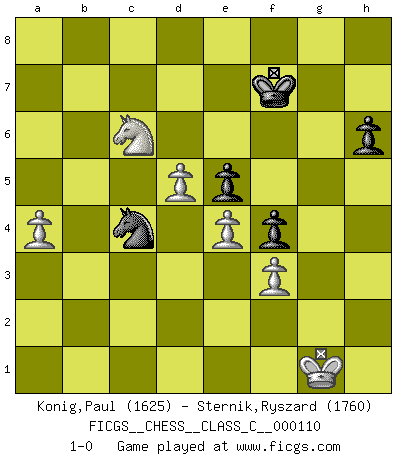 Last move : 1-0 2009 June 25 22:45:5 [Event "FICGS__CHESS__CLASS_C__000110"] [Site "FICGS"] [Date "2009.03.21"] [Round "1"] [White "Konig,Paul"] [Black "Sternik,Ryszard"] [Result "1-0"] [WhiteElo "1625"] [BlackElo "1760"] 1.d4 Nf6 2.c4 g6 3.Nc3 Bg7 4.e4 d6 5.f4 O-O 6.Bd3 Nc6 7.Nf3 Bg4 8.Be2 e5 9.fxe5 dxe5 10.d5 Nd4 11.O-O Qe7 12.Be3 c5 13.Qd2 a6 14.h3 Bxf3 15.Bxf3 Ne8 16.b3 Nd6 17.Na4 Qc7 18.Rac1 b6 19.Bg5 f5 20.Qd3 h6 21.Bh4 Nxf3+ 22.gxf3 Rab8 23.Bg3 Kh7 24.Qe2 f4 25.Be1 Nf7 26.Nb2 Qd6 27.Nd3 Ng5 28.h4 Nf7 29.b4 Rfc8 30.bxc5 bxc5 31.Qg2 Bf6 32.Kh1 Be7 33.Rg1 Rg8 34.Qh3 Rb6 35.h5 Ng5 36.Qg4 Qf6 37.Bf2 gxh5 38.Qxh5 R6b8 39.Rb1 Rxb1 40.Rxb1 Rg7 41.a4 Nf7 42.Rg1 Rxg1+ 43.Kxg1 Qg6+ 44.Qxg6+ Kxg6 45.Bxc5 Bxc5+ 46.Nxc5 Nd6 47.Nxa6 Nxc4 48.Nb8 Kf7 49.Nc6 1-0 King's Indian : Four pawns attack Kingside Castling by player Black (move 5) Kingside Castling by player White (move 11) Player White won this chess game. Follow this game move after move (download)Good positions don't win games, good moves do. (Gerald Abrahams) Der 70jährige Viktor Kortschnoi: Die Rentenanstalt wollte mich zwingen in Rente zu gehen. Meine Frau erhält jetzt eine Pension- und ich zahle weiter in die Rentenkasse ein! (Viktor Kortschnoi) Siempre es mejor sacrificar los hombres de tu oponente. (Savielly Tartakower) Pour moi, les échecs ne sont pas un jeu mais un art. (Alexandre Alekhine) Good decisions come from experience, and experience comes from bad decisions. (Anonymous)