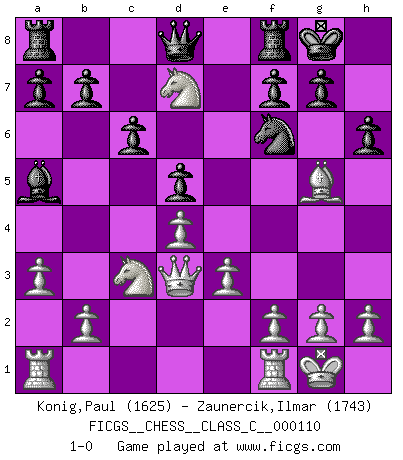 Last move : 1-0 2009 July 13 22:26:27 [Event "FICGS__CHESS__CLASS_C__000110"] [Site "FICGS"] [Date "2009.03.21"] [Round "1"] [White "Konig,Paul"] [Black "Zaunercik,Ilmar"] [Result "1-0"] [WhiteElo "1625"] [BlackElo "1743"] 1.d4 d5 2.c4 e6 3.Nc3 Nf6 4.cxd5 exd5 5.Bg5 c6 6.e3 Bf5 7.Bd3 Bxd3 8.Qxd3 Bb4 9.Nf3 Nbd7 10.O-O O-O 11.a3 Ba5 12.Ne5 h6 13.Nxd7 1-0 This chess game has been lost on time (started : 2009.03.21 14:22:45) QGD : Exchange, positional line, 5...c6 Kingside Castling by player White (move 10) Kingside Castling by player Black (move 10) Player White won this chess game. Follow this game move after move (download)Up to this point White has been following well-known analysis. But now he makes a fatal error: he begins to use his own head. (Siegbert Tarrasch) Es gibt Leute, die glauben, alles wäre vernünftig, was man mit einem ernsthaften Gesicht tut. (Georg Christoph Lichtenberg) Un mal día en el Ajedrez, es mejor que cualquier buen día en el trabajo. (Anonymous) Toutes choses étant égales, c'est la conviction qui gagne. Alliée à une volonté de vaincre, elle sert de détonateur, suscite des idées, disperse les doutes et aide à penser clairement. (Robert Fischer) Nowadays, anyone who cannot speak English and is incapable of using the Internet is regarded as backward. (Al-Waleed bin Talal)