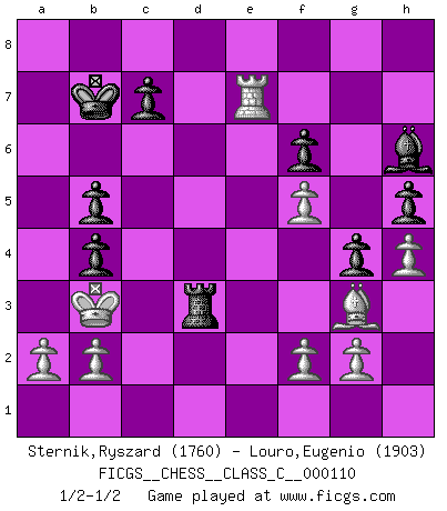 Last move : 1/2-1/2 2009 August 10 0:17:41 [Event "FICGS__CHESS__CLASS_C__000110"] [Site "FICGS"] [Date "2009.03.21"] [Round "1"] [White "Sternik,Ryszard"] [Black "Louro,Eugenio"] [Result "1/2-1/2"] [WhiteElo "1760"] [BlackElo "1903"] 1.e4 e5 2.Nf3 Nc6 3.Bb5 a6 4.Bxc6 dxc6 5.Nc3 f6 6.d4 exd4 7.Nxd4 c5 8.Nde2 Qxd1+ 9.Nxd1 Be6 10.Bf4 O-O-O 11.Ne3 g5 12.Bg3 h5 13.h4 Bg7 14.Rd1 Rxd1+ 15.Kxd1 Ne7 16.Kc1 b5 17.c4 Nc6 18.Nd5 Nb4 19.Nxb4 cxb4 20.cxb5 axb5 21.Nd4 Bd7 22.Nf5 Bxf5 23.exf5 g4 24.Re1 Rd8 25.Re6 Bh6+ 26.Kc2 Rd2+ 27.Kb3 Kb7 28.Re7 Rd3+ 29.Kc2 Rd2+ 30.Kb3 Rd3+ 31.Kc2 Rd2+ 32.Kb3 Rd3+ 1/2-1/2 Ruy Lopez : Exchange, Keres variation Queenside Castling by player Black (move 10) This chess game ended in a draw. Follow this game move after move (download)Could we look into the head of a Chess player, we should see there a whole world of feelings, images, ideas, emotion and passion. (Alfred Binet) Es hat in meinem Leben Zeiten gegeben, in denen das Schachspiel, wenn nicht zum Lebenszweck, so doch zu einem regelrechten Lebensersatz geworden ist. Man fühlt sich in solchen Zeiten nicht so, als besäße man eine göttliche Gabe, sondern eher so, als sei man von ihr besessen. (Garry Kasparov) El tablero es el mundo, las piezas es el fenomeno del universo, las reglas del juego son lo que llamamos leyes de la naturaleza y el jugador del lado opuesto, se encuentra oculto a nuestra vista. (Thomas Huxley) Botvinnik disait en comparant les échecs à la musique: Il existe une science dont le but est l'étude de l'acoustique et des sons. Mais il y a aussi un art qui se sert de l'océan des sons : c'est la musique. De toute évidence, il en est de même pour la pensée. La logique est l'étude des lois de la réflexion et les échecs reflètent, en tant qu'art, le côté logique de la réflexion, sous la forme d'images artistiques... Extrait de Fischer - Spassky, Reykjavik 1972 par Alexander & F. Wyndham (Ed. Solar), p 37. We cannot be sure of having something to live for unless we are willing to die for it. (Ernesto Che Guevara)