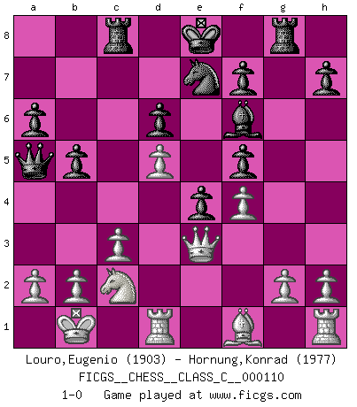 Last move : 1-0 2009 October 5 8:53:43 [Event "FICGS__CHESS__CLASS_C__000110"] [Site "FICGS"] [Date "2009.03.21"] [Round "1"] [White "Louro,Eugenio"] [Black "Hornung,Konrad"] [Result "1-0"] [WhiteElo "1903"] [BlackElo "1977"] 1.e4 c5 2.Nf3 Nc6 3.d4 cxd4 4.Nxd4 Nf6 5.Nc3 e5 6.Ndb5 d6 7.Bg5 a6 8.Na3 b5 9.Bxf6 gxf6 10.Nd5 f5 11.Bd3 Be6 12.c3 Bg7 13.Qf3 Bxd5 14.exd5 e4 15.Qg3 Be5 16.f4 Bf6 17.O-O-O Ne7 18.Bf1 Qa5 19.Kb1 Rg8 20.Qe3 Rc8 21.Nc2 1-0 This chess game has been lost on time (started : 2009.03.21 14:22:45) Sicilian : Pelikan (Lasker/Sveshnikov) variation Queenside Castling by player White (move 17) Player White won this chess game. Follow this game move after move (download)The hallmark of the artist is simplicity. (Larry Evans) Bis zum Jahr 1971 verlief in meiner Schachkariere alles glatt. Dieses dramatische Match [Fischer-Taimanov 6:0] machte mein Leben zur Hölle. (Mark Taimanov) Solo los afeminados hacen el Enroque. (Rob Sillars) Je menace de comprendre la position. (Anonyme) The general who wins the battle makes many calculations in his temple before the battle is fought. The general who loses makes but few calculations beforehand. (Sun Tzu)