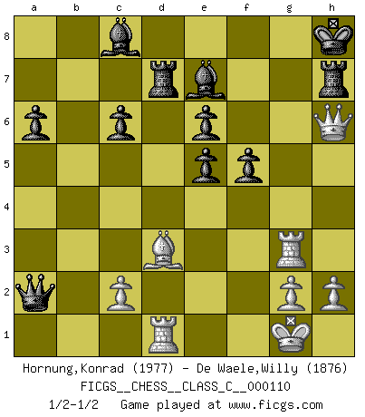 Last move : 1/2-1/2 2009 June 27 0:0:53 [Event "FICGS__CHESS__CLASS_C__000110"] [Site "FICGS"] [Date "2009.03.21"] [Round "1"] [White "Hornung,Konrad"] [Black "De Waele,Willy"] [Result "1/2-1/2"] [WhiteElo "1977"] [BlackElo "1876"] 1.e4 c5 2.Nf3 d6 3.d4 cxd4 4.Nxd4 Nf6 5.Nc3 a6 6.Bg5 e6 7.f4 Qb6 8.Qd2 Qxb2 9.Rb1 Qa3 10.f5 Nc6 11.fxe6 fxe6 12.Nxc6 bxc6 13.e5 dxe5 14.Bxf6 gxf6 15.Ne4 Qxa2 16.Rd1 Be7 17.Be2 O-O 18.O-O Ra7 19.Rf3 Rd7 20.Bd3 f5 21.Qh6 Rf7 22.Rg3+ Kh8 23.Ng5 Rg7 24.Nxh7 Rxh7 1/2-1/2 Sicilian : Najdorf, 7...Qb6 Kingside Castling by player Black (move 17) Kingside Castling by player White (move 18) This chess game ended in a draw. Follow this game move after move (download)I give 98 percent of my mental energy to Chess. Others give only 2 percent. (Bobby Fischer) Schach ist wie eine schöne Frau, zu der wir ständig zurückkehren, gleichviel, wie oft sie uns zurückweist. (Anonymous) Un juego de Ajedrez es un dialogo, una conversación entre un jugador y su oponente. Cada movimiento del oponente puede contener amenazas o tropiezos, pero un jugador no se puede defender de las amenazas o tomar ventaja de los tropiezos si es que no se pregunta a sí mismo: ¿Que es lo que mi oponente va a hacer después de cada movida?. (Bruce A. Moon) Les erreurs sont comme les malheurs, elles n'arrivent jamais seules. (Siegbert Tarrasch) The existence of forgetting has never been proved: We only know that some things don't come to mind when we want them. (Friedrich Nietzsche)