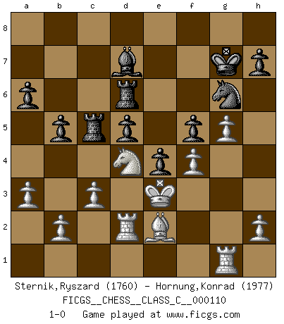 Last move : 1-0 2009 September 3 9:57:29 [Event "FICGS__CHESS__CLASS_C__000110"] [Site "FICGS"] [Date "2009.03.21"] [Round "1"] [White "Sternik,Ryszard"] [Black "Hornung,Konrad"] [Result "1-0"] [WhiteElo "1760"] [BlackElo "1977"] 1.e4 c5 2.Nf3 Nc6 3.d4 cxd4 4.Nxd4 Nf6 5.Nc3 e5 6.Ndb5 d6 7.Bg5 a6 8.Bxf6 gxf6 9.Na3 b5 10.Nd5 f5 11.Bd3 Be6 12.c3 Bg7 13.Qh5 O-O 14.exf5 Bxd5 15.f6 e4 16.fxg7 Re8 17.Be2 Re5 18.Qh6 Qg5 19.Qxg5 Rxg5 20.Nc2 Kxg7 21.Ne3 Be6 22.f4 Rc5 23.Rf1 f5 24.Rd1 d5 25.g4 Ne7 26.Rg1 Kf6 27.g5+ Kg7 28.Nc2 Rd8 29.Nd4 Bc8 30.Kf2 Ng6 31.Ke3 Rd6 32.Rd2 Bd7 33.a3 1-0 This chess game has been lost on time (started : 2009.03.21 14:22:45) Sicilian : Pelikan (Lasker/Sveshnikov) variation Kingside Castling by player Black (move 13) Player White won this chess game. Follow this game move after move (download)Help your pieces so they can help you. (Paul Morphy) Im Blitz ist es einfacher mit einer Figur weniger anzugreifen, als sich mit einer Mehrfigur zu verteidigen. (Mikhail Nekhemyevich Tal) El Ajedrez es un juego de pelea el cual es puramente intelectual e incluye la suerte. (Richard Reti) Demandez au pauvre Cg1 ce qu'il en pense. Eduard Gufeld à propos de la variante Saemisch de l'Est-Indienne. The Movers & Shakers of this world are those who play chess in the mornings and go to the disco in the evenings. (Dinesh De Silva)