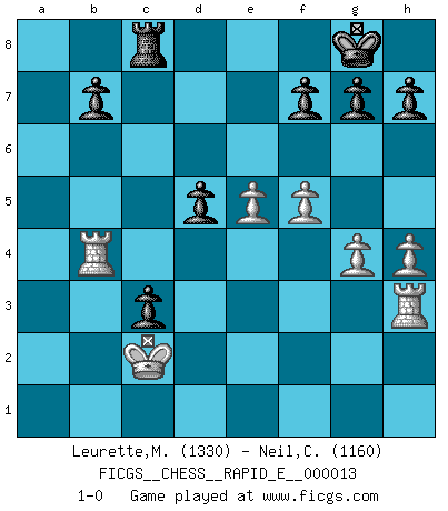 Last move : 1-0 2009 April 22 11:34:50 [Event "FICGS__CHESS__RAPID_E__000013"] [Site "FICGS"] [Date "2009.03.21"] [Round "1"] [White "Leurette,Marc-Antoine"] [Black "Neil,Charlie"] [Result "1-0"] [WhiteElo "1330"] [BlackElo "1160"] 1.e4 e6 2.d4 d5 3.Nc3 Nf6 4.Bg5 Be7 5.e5 Nfd7 6.Bxe7 Qxe7 7.f4 a6 8.Nf3 c5 9.Qd2 Nc6 10.O-O-O cxd4 11.Nxd4 O-O 12.h4 Nc5 13.g4 Bd7 14.Bg2 Nb4 15.Kb1 Ba4 16.a3 Nc6 17.b4 Nxd4 18.Qxd4 Rac8 19.bxc5 Bd7 20.Qb4 Rxc5 21.Na4 Rb5 22.Qxb5 Bxb5 23.Rd4 Qxa3 24.Rh3 Qe7 25.Nc3 Rc8 26.Nxb5 axb5 27.c3 Qa3 28.c4 Qb4+ 29.Kc2 bxc4 30.Bxd5 exd5 31.f5 c3 32.Rxb4 1-0 French : Classical, Steinitz variation Queenside Castling by player White (move 10) Kingside Castling by player Black (move 11) Player White won this chess game. Follow this game move after move (download)I'm not afraid of Spassky. The world knows I'm the best. You don't need a match to prove it. (Bobby Fischer) Über Frauen: Chess is better. (Robert James Fischer) Los problemas de Ajedrez exigen del compositor las mismas virtudes que caracterizan todo el arte de valor: originalidad, invención, concisión, armonía, complejidad e insinceridad explendida. (Vladimir Nabokov) Une platitude souvent récitée à propos des Echecs est qu'une des choses les plus difficiles à réaliser est de gagner une position gagnante. Cela ne manque pas de sens mais, pour ma part, j'ai toujours trouvé plus difficile de gagner une position perdante. (Tim Krabbe) The only thing that overcomes hard luck is hard work. (Harry Golden)