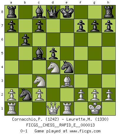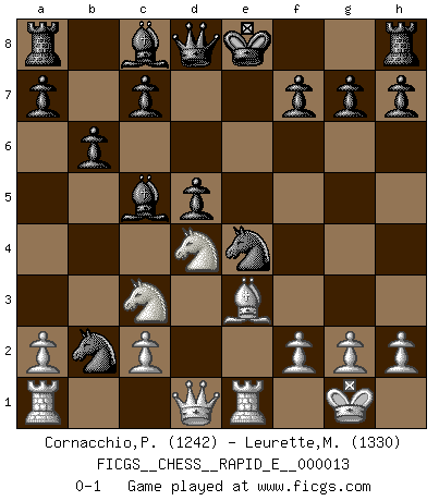 Last move : 0-1 2009 May 5 16:57:7 [Event "FICGS__CHESS__RAPID_E__000013"] [Site "FICGS"] [Date "2009.03.21"] [Round "1"] [White "Cornacchio,Patrick"] [Black "Leurette,Marc-Antoine"] [Result "0-1"] [WhiteElo "1242"] [BlackElo "1330"] 1.e4 e5 2.Nf3 Nc6 3.d4 exd4 4.Bc4 Nf6 5.e5 Ne4 6.Nxd4 Nxe5 7.O-O Nxc4 8.Re1 d5 9.Bf4 Bc5 10.Be3 b6 11.Nc3 Nxb2 0-1 This chess game has been lost on time (started : 2009.03.21 15:49:56) Scotch gambit : Dubois-Reti defense Kingside Castling by player White (move 7) Player Black won this chess game. Follow this game move after move (download)When I have White, I win because I am white; When I have Black, I win because I am Bogolyubov. (Bogolyubov) Nur ein wirklich starker Spieler weiß wie schwach er spielt. (Savielly Grigorievitsch Tartakower) Los Peones son el alma de una partida de Ajedrez. (Francois Andre Danican Philidor) Les Echecs sont et restent toujours un combat, un combat intégral comme la boxe, la lutte ou un autre sport, et où il doit y avoir un vainqueur et un vaincu. (Joseph Emil Diemer) To steal ideas from one person is plagiarism. To steal from many is research. (Unknown)