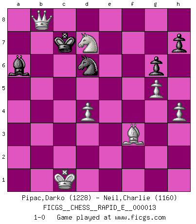 Last move : 1-0 2009 April 22 10:5:13 [Event "FICGS__CHESS__RAPID_E__000013"] [Site "FICGS"] [Date "2009.03.21"] [Round "1"] [White "Pipac,Darko"] [Black "Neil,Charlie"] [Result "1-0"] [WhiteElo "1228"] [BlackElo "1160"] 1.e4 e6 2.d4 d5 3.exd5 exd5 4.Nf3 Bg4 5.Qe2+ Qe7 6.Qxe7+ Bxe7 7.Ne5 Be6 8.a3 Nf6 9.Bg5 Nbd7 10.Bb5 c6 11.Ba4 Ne4 12.Bxe7 Kxe7 13.Nxd7 Kxd7 14.f3 Nf6 15.Nc3 Rae8 16.O-O-O Nh5 17.g3 Kd6 18.Rhe1 g6 19.b4 b5 20.Bb3 Ng7 21.g4 f5 22.h3 Bc8 23.a4 fxg4 24.fxg4 a6 25.axb5 Ne6 26.bxc6 Nc7 27.Re5 Kxc6 28.Bxd5+ Kd6 29.Rxe8 Rxe8 30.Bc4 Re3 31.Rd3 Rxd3 32.Bxd3 Bd7 33.Ne4+ Ke7 34.c3 Bb5 35.c4 Ba4 36.Nc3 Bc6 37.b5 axb5 38.cxb5 Bg2 39.h4 Kd6 40.Be4 Bf1 41.b6 Ne8 42.Bf3 Kd7 43.Nd5 Kc8 44.b7+ Kb8 45.g5 Ba6 46.Nf6 Nd6 47.Nd7+ Kc7 48.b8Q+ 1-0 French : Exchange variation Queenside Castling by player White (move 16) Promotion Queen by player White (move 48) Player White won this chess game. Follow this game move after move (download)On the chessboard, lies and hypocrisy do not survive long. (Emanuel Lasker) Wir können eben der zündenden Macht des Opfers nicht wiederstehen, denn die Begeisterung für das Opfer liegt in der Natur des Menschen. (Rudolf Spielmann) No hay otro maestro que tenga una voluntad terrífica de ganar. Al tablero, el irradía peligro y aún los oponentes mas fuertes tienden a congelarse como liebres cuando olfatean a una pantera. Aún sus debilidades son peligrosas. Con las blancas, su juego de apertura es predecible - te es posible hacer planes en su contra - pero es tan fuerte que tus planes casi nunca funcionan. En el juego medio, su precisión e invención son fabulosas y en finales, tú simplemente no le puedes vencer. (Experto Alemán anónimo) Toute estimation doit être constamment réévaluée. (Jacob Estrin) A woman without a man is like a fish without a bicycle. (Gloria Steinem)