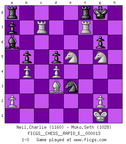 Last move : 1-0 2009 April 14 21:17:29 [Event "FICGS__CHESS__RAPID_E__000013"] [Site "FICGS"] [Date "2009.03.21"] [Round "1"] [White "Neil,Charlie"] [Black "Moko,Seth"] [Result "1-0"] [WhiteElo "1160"] [BlackElo "1028"] 1.d4 d5 2.c4 e6 3.Nf3 Bb4+ 4.Bd2 Bxd2+ 5.Nbxd2 Nf6 6.e3 O-O 7.cxd5 exd5 8.Bd3 Nc6 9.O-O Ng4 10.h4 Ne7 11.Rc1 c6 12.Qc2 g6 13.Ng5 Qd6 14.Ndf3 Nf5 15.h5 b5 16.Ne5 Ba6 17.Qxc6 Qxc6 18.Rxc6 Bb7 19.Rc7 Ba6 20.hxg6 hxg6 21.b4 Nfxe3 22.fxe3 Nxe3 23.R1xf7 1-0 Queen's gambit declined Kingside Castling by player Black (move 6) Kingside Castling by player White (move 9) Player White won this chess game. Follow this game move after move (download)It is difficult to play against Einstein's theory --on his first loss to Fischer. (Mikhail Tal) Wenn man heute mit 14 Jahren noch kein GM ist, kann man es vergessen. (Viswanathan Anand) Los tropiezos estan todos ahí en el tablero, esperando que se cometan. (Savielly Tartakover) Les Echecs, c'est l'art de la guerre sans les charniers, c'est la résurrection des morts tombés au champ d'honneur, l'espoir perpétuel, la suprématie de l'intelligence sur la force, la culture de l'esprit. (F. Szpiner) Perception is reality. (Immanuel Kant)