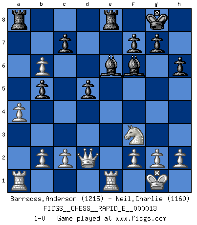 Last move : 1-0 2009 April 7 21:52:1 [Event "FICGS__CHESS__RAPID_E__000013"] [Site "FICGS"] [Date "2009.03.21"] [Round "1"] [White "Barradas,Anderson"] [Black "Neil,Charlie"] [Result "1-0"] [WhiteElo "1215"] [BlackElo "1160"] 1.e4 e6 2.d4 d5 3.Nc3 Nf6 4.Bg5 Be7 5.exd5 exd5 6.Nf3 O-O 7.Be2 h6 8.Bxf6 Bxf6 9.O-O Nc6 10.Re1 Re8 11.Bb5 Be6 12.Bxc6 bxc6 13.a3 Qd6 14.Qd2 c5 15.Nb5 Qb6 16.a4 a6 17.dxc5 axb5 18.cxb6 1-0 French : Classical Kingside Castling by player Black (move 6) Kingside Castling by player White (move 9) Player White won this chess game. Follow this game move after move (download)The winner of the game is the player who makes the next-to-last mistake. (Savielly Tartakover) In der Schule lernt man nichts. Es ist nur Zeitverschwendung. (Robert James Fischer) Combinaciones deslumbrantes son para la mayoría, mover madera es para los pocos. (Georg Kieninger) Toutes choses étant égales, c'est la conviction qui gagne. Alliée à une volonté de vaincre, elle sert de détonateur, suscite des idées, disperse les doutes et aide à penser clairement. (Robert Fischer) The Internet isn't free. It just has an economy that makes no sense to capitalism. (Brad Shapcott)