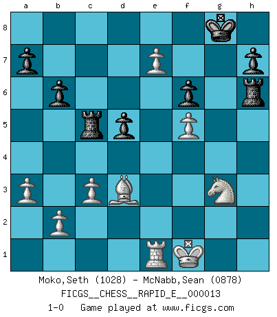 Last move : 1-0 2009 April 14 22:48:11 [Event "FICGS__CHESS__RAPID_E__000013"] [Site "FICGS"] [Date "2009.03.21"] [Round "1"] [White "Moko,Seth"] [Black "McNabb,Sean"] [Result "1-0"] [WhiteElo "1028"] [BlackElo "0878"] 1.d4 Nf6 2.Bf4 e6 3.Nf3 Bb4+ 4.Nbd2 Nc6 5.c3 Bd6 6.Bxd6 cxd6 7.e3 O-O 8.Bd3 b6 9.O-O Bb7 10.Re1 e5 11.dxe5 dxe5 12.Qc2 e4 13.Nxe4 Re8 14.Nd6 Re6 15.Nxb7 Qe8 16.Ng5 Re5 17.Nd6 Qe7 18.Nf5 Qc5 19.Nf3 R5e8 20.e4 Ne5 21.Nxe5 Qxe5 22.g3 Rac8 23.f4 Qc5+ 24.Qf2 Qxf2+ 25.Kxf2 Ng4+ 26.Kf1 Nxh2+ 27.Kg1 Nf3+ 28.Kf1 Nxe1 29.Rxe1 Rc5 30.Nd6 Re7 31.Nf5 Re6 32.g4 g6 33.Ng3 Ra5 34.a3 d5 35.f5 gxf5 36.gxf5 Rh6 37.e5 f6 38.e6 Rc5 39.e7 1-0 Queen's pawn game Kingside Castling by player Black (move 7) Kingside Castling by player White (move 9) Player White won this chess game. Follow this game move after move (download)Who is your opponent tonight, tonight I am playing against the Black pieces. (Akiba Rubinstein) Zum Sieg gelangt man nicht, wenn man gut, sondern nur wenn man besser spielt (Savielly Grigorievitsch Tartakower) Las Aperturas te enseñan aperturas. ¡Los Finales te enseñan Ajedrez!. (Stephan Gerzadowicz) On croit qu'il y a plus de mauvais joueurs que de bons joueurs, c'est faux : Il y a autant de joueurs qui gagnent que de joueurs qui perdent. (Philippe Geluck) Perhaps chess is the wrong game for the times (The Chess Master and the Computer, by Garry Kasparov - 2010)