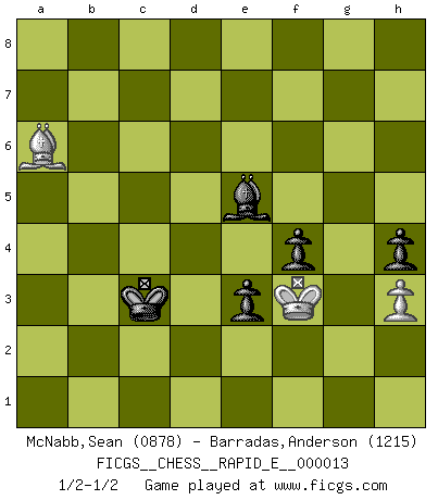 Last move : 1/2-1/2 2009 April 13 14:14:40 [Event "FICGS__CHESS__RAPID_E__000013"] [Site "FICGS"] [Date "2009.03.21"] [Round "1"] [White "McNabb,Sean"] [Black "Barradas,Anderson"] [Result "1/2-1/2"] [WhiteElo "0878"] [BlackElo "1215"] 1.d4 d5 2.c4 c6 3.Nc3 Nf6 4.Nf3 Nbd7 5.Bf4 e6 6.a3 a6 7.e3 b5 8.cxb5 axb5 9.Bd3 Be7 10.O-O O-O 11.b4 Nb6 12.Ne5 Bb7 13.a4 Nbd7 14.axb5 Nxe5 15.Bxe5 Bxb4 16.bxc6 Bxc6 17.Nb5 Rxa1 18.Qxa1 Bxb5 19.Bxb5 Ne4 20.Rc1 Qb6 21.Qa6 Qxa6 22.Bxa6 f6 23.Bc7 Ra8 24.Bb5 Bd2 25.Rc6 Ra1+ 26.Bf1 Kf7 27.Bb6 Be1 28.g3 Bxf2+ 29.Kg2 Bxe3 30.Rc7+ Kg6 31.Bd3 Ra2+ 32.Rc2 Rxc2+ 33.Bxc2 f5 34.Ba4 Nc3 35.Be8+ Kh6 36.Kf3 Bg1 37.Bf7 e5 38.Ba5 Bxd4 39.Bxc3 Bxc3 40.Bxd5 e4+ 41.Ke2 g5 42.h3 Kg6 43.Ke3 Kf6 44.Bg8 h5 45.Bd5 Ke5 46.Bf7 h4 47.gxh4 gxh4 48.Bc4 f4+ 49.Kf2 Kd4 50.Ba6 e3+ 51.Kf3 Ke5 52.Be2 Kf5 53.Bd3+ Kg5 54.Ba6 Be5 55.Be2 Bc7 56.Bd3 Kf6 57.Kg4 Ke5 58.Kf3 Kd4 59.Be2 Be5 60.Ba6 Kc3 1/2-1/2 QGD Slav defense Kingside Castling by player White (move 10) Kingside Castling by player Black (move 10) 10 pieces endgame at move 40 : White KBPP , Black KBPPPP WHITE : King + 1 Bishop 2 Pawns BLACK : King + 1 Bishop 4 Pawns 9 pieces endgame at move 47 : White KBPP , Black KBPPP WHITE : King + 1 Bishop 2 Pawns BLACK : King + 1 Bishop 3 Pawns 8 pieces endgame at move 47 : White KBP , Black KBPPP WHITE : King + 1 Bishop 1 Pawn BLACK : King + 1 Bishop 3 Pawns This chess game ended in a draw. Follow this game move after move (download)If your opponent offers you a draw, try to work out why he thinks he's worse off. (Nigel Short) Als er Schachweltmeister wurde ließ er praktisch alle stärksten Sovietspieler für sich arbeiten. Wenn ein auch nur mittelmässiger Meister ein Spezialist für eine bestimmte Eröffnung war, wurde er von Karpov gerufen. Das wurde alles geheim gehalten. (Mikhail Moiseyevich Botvinik) El Ajedrez no es una pizca de inferior al violín, y tenemos un gran número de violinistas profesionales. (Mikhail Botvinnik) La menace est plus forte que l'exécution. (Aaron Nimzovitch) Mac users swear by their computers. PC users swear at their computers. (Author unknown)