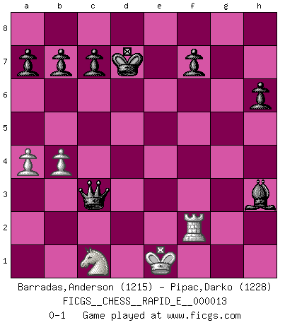Last move : 0-1 2009 April 8 20:37:54 [Event "FICGS__CHESS__RAPID_E__000013"] [Site "FICGS"] [Date "2009.03.21"] [Round "1"] [White "Barradas,Anderson"] [Black "Pipac,Darko"] [Result "0-1"] [WhiteElo "1215"] [BlackElo "1228"] 1.e4 e5 2.Nf3 Nc6 3.Bb5 d6 4.O-O Bd7 5.Bxc6 Bxc6 6.Nc3 Nf6 7.d3 h6 8.a3 Qe7 9.Re1 O-O-O 10.b4 d5 11.Bb2 d4 12.Na2 Bd7 13.c3 Bg4 14.h3 Bh5 15.g4 Bg6 16.cxd4 exd4 17.Nxd4 Qd6 18.Nb5 Qb6 19.a4 Nxe4 20.Qf3 Ng5 21.Qg3 Rxd3 22.Re8+ Kd7 23.Qe5 Nxh3+ 24.Kh1 Nxf2+ 25.Kg2 Be4+ 26.Kf1 Bd6 27.Nxd6 Rxe8 28.Nxe8 Rd2 29.Rc1 Bd3+ 30.Ke1 Re2+ 31.Qxe2 Bxe2 32.Nxg7 Bxg4 33.Kf1 Bh3+ 34.Ke2 Bg4+ 35.Kf1 Nd3 36.Rc2 Nxb2 37.Rxb2 Qf6+ 38.Rf2 Qxg7 39.Nc1 Bh3+ 40.Ke1 Qc3+ 0-1 Ruy Lopez : Old Steinitz defense Kingside Castling by player White (move 4) Queenside Castling by player Black (move 9) Player Black won this chess game. Follow this game move after move (download)You cannot play at Chess if you are kind-hearted. (French Proverb) Heutzutage gewinnt im Turnier nicht derjenige Spieler, der weitreichende Pläne entwirft, sondern einfach jener, der Zug um Zug kämpft. (David Bronstein) Ciertamente el estado mental actual de Bobby Fischer es una tragedia. Uno de los mas grandes jugadores de Ajedrez del mundo -el orgullo y pena del Ajedrez Americano. (Frank Brady) Echiquier : carré parfait, comme la Jérusalem nouvelle décrite par l'auteur de l'Apocalypse, huit cases sur huit, exaltation du chiffre 4, symbole du cosmos aux quatre horizons... où le noir et le blanc, l'ombre et la lumière, le mal et le bien s'entremêlent et se conjuguent. (Robert Couffignal, Le Gambit du poète) Somehow our devils are never quite what we expect when we meet them face to face. (Nelson DeMille)