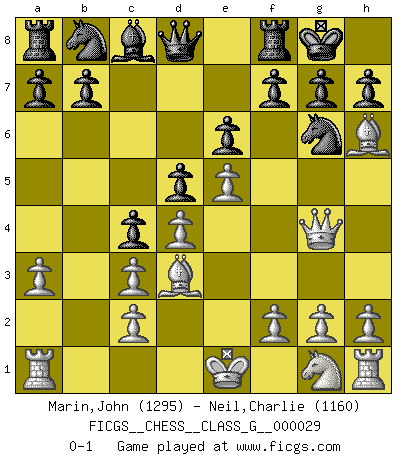 Last move : 0-1 2009 May 11 5:31:15 [Event "FICGS__CHESS__CLASS_G__000029"] [Site "FICGS"] [Date "2009.03.21"] [Round "1"] [White "Marin,John"] [Black "Neil,Charlie"] [Result "0-1"] [WhiteElo "1295"] [BlackElo "1160"] 1.e4 e6 2.d4 d5 3.Nc3 Bb4 4.e5 c5 5.a3 Bxc3+ 6.bxc3 Ne7 7.Qg4 O-O 8.Bd3 c4 9.Bh6 Ng6 0-1 This chess game has been lost on time (started : 2009.03.21 16:20:53) French : Winawer, Advance, poisoned pawn variation Kingside Castling by player Black (move 7) Player Black won this chess game. Follow this game move after move (download)Chess is a fighting game which is purely intellectual and includes chance. (Richard Reti) Ich glaube nicht an Psychologie, ich glaube an gute Züge. (Robert James Fischer) Los tropiezos estan todos ahí en el tablero, esperando que se cometan. (Savielly Tartakover) Le système Elo représente seulement une moyenne. Il est simplement un indicateur de votre stabilité. (Anatoli Karpov) Opportunities multiply as they are seized. (Sun Tzu)