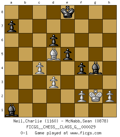Last move : 0-1 2009 April 10 22:16:41 [Event "FICGS__CHESS__CLASS_G__000029"] [Site "FICGS"] [Date "2009.03.21"] [Round "1"] [White "Neil,Charlie"] [Black "McNabb,Sean"] [Result "0-1"] [WhiteElo "1160"] [BlackElo "0878"] 1.c4 e5 2.g3 Nc6 3.Nc3 Bc5 4.d3 d6 5.a3 Nf6 6.Bg2 O-O 7.Bg5 Qd7 8.Bxf6 gxf6 9.Nd5 Qf5 10.Nf3 Nd4 11.Nxc7 Rb8 12.Nxd4 Bxd4 13.e3 Bxb2 14.Rb1 Bxa3 15.Nd5 Re8 16.g4 Qg5 17.Qf3 Bxg4 18.Qxf6 h6 19.Qxg5+ hxg5 20.Nf6+ Kf8 21.Nxe8 Kxe8 22.O-O f5 23.Rxb7 Rxb7 24.Bxb7 f4 25.exf4 gxf4 26.Ra1 Bc5 27.Kg2 Bd4 28.Bd5 Bxa1 0-1 English Opening Kingside Castling by player Black (move 6) Kingside Castling by player White (move 22) Player Black won this chess game. Follow this game move after move (download)First-class players lose to second-class players because second-class players sometimes play a first-class game. (Siegbert Tarrasch) Alle Schachspieler sollten auch ein Hobby haben. (Savielly Grigorievitsch Tartakower) Desconfianza es la característica mas necesaria de un jugador de Ajedrez. (Siegbert Tarrasch) Les Echecs, c'est l'art de la guerre sans les charniers, c'est la résurrection des morts tombés au champ d'honneur, l'espoir perpétuel, la suprématie de l'intelligence sur la force, la culture de l'esprit. (F. Szpiner) When the going gets tactical, the computers get going. (Hyatt)